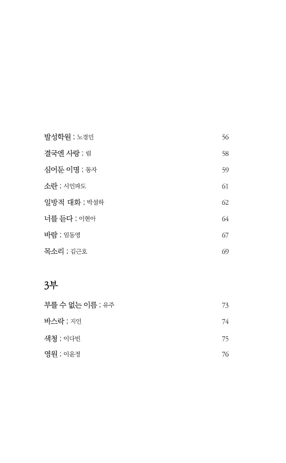 김청연, 조주안, 신모과, 이승우, 조민주, 여진, 혜월, 최현서, 수현, 정호준, 재인, 이암도, 박인화, 무아, 김캐슈넛, 김민주, 정영훈, 홍예진, 라은아, 김유비, 소하, 김범석, 안소연, 연하기, 꽃처럼,썬, 정성주, 양냥이, 유월의봄, 노경민, 림, 동자, 시인파도, 박설하, 이현아, 임동영, 김근호, 유주, 지인, 이다빈, 이윤정, 최규석, winter.k, 김라면, 박예지, 현영, 기묘한, felix, 수빈, 최예지, 연우, 손민지, 이은수, 연지, 조보경, 경예, 마윤석, 고온, 9958
