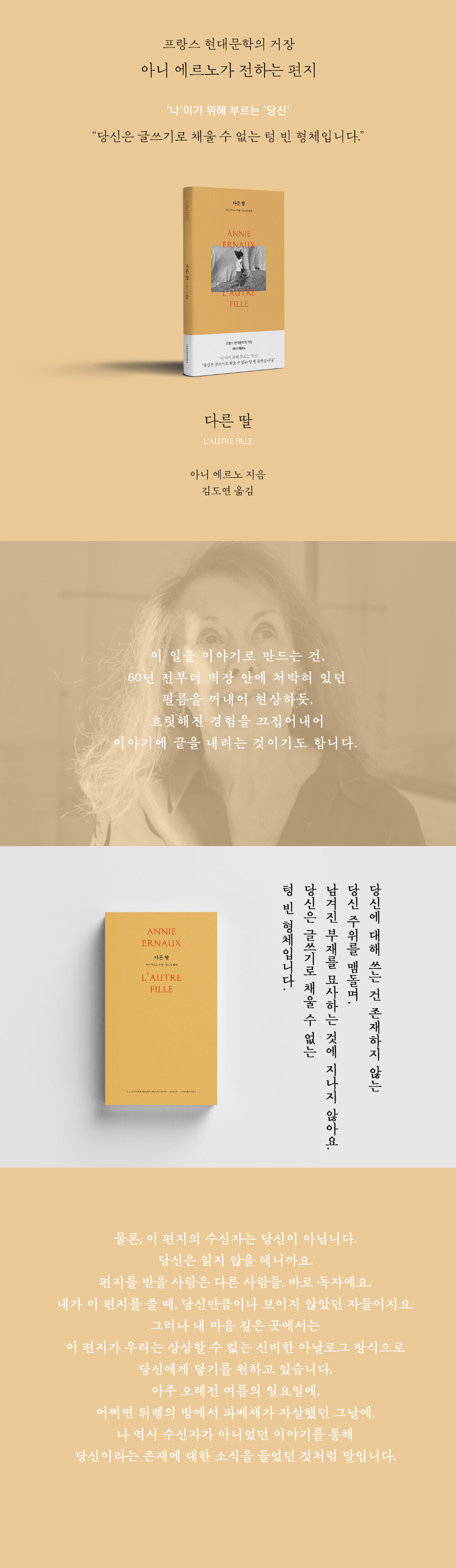 Nil 출판사의 편지 시리즈 기획(‘Les Affranchis’)의 첫 번째 작품이기도 한 <다른 딸>은 한 번도 써본 적 없는 편지를 써달라는 출판사의 제안으로부터 출발했다. 그리하여 시작되는 이 편지는 아니 에르노 특유의 아름다운 칼날 같은 문체를 통해 우아한 유속으로, 그러나 확실하게 ‘나의 흔적에 얹힌’ 당신을 거슬러 올라간다. 처음으로 죽은 언니의 존재를 알게 된 순간 촉발된 어린아이의 불안과 혼란, 부재와 존재의 탐구, 그리고 마침내 ‘당신’에 대한 글을 쓰는 행위를 통해 온전한 ‘나’로 향하고자 하는 여정이 모두 여기, 이 물결에 스며있다.