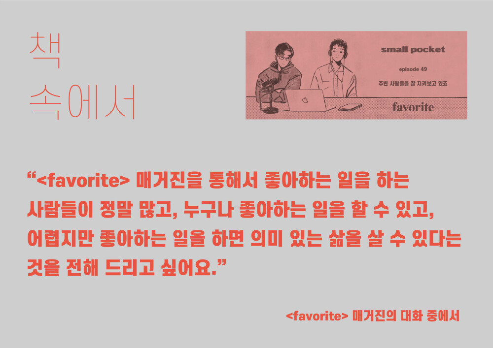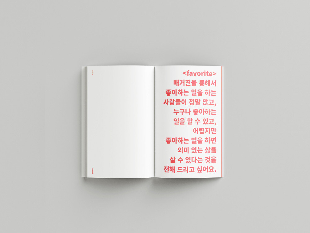 좋아하는 일을 하는 사람들의 이야기를 인터뷰 형식으로 담은 매거진 ‘favorite’을 발행하고 있으며,