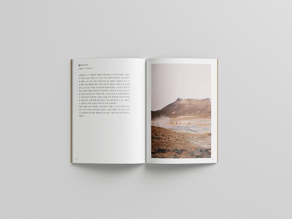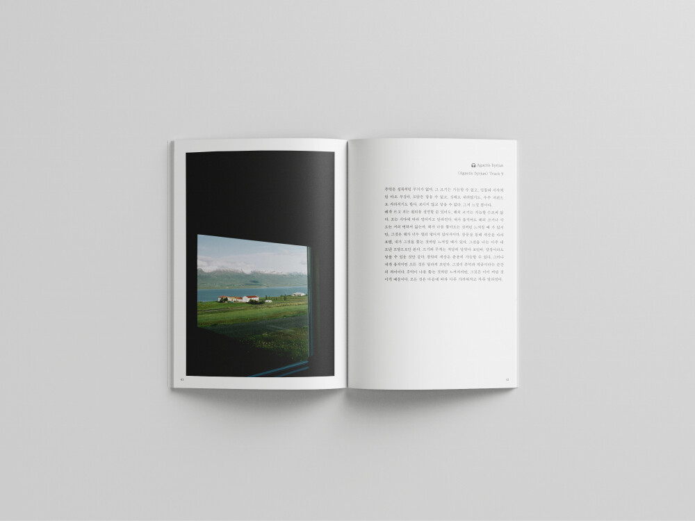 sigur ros의 음악과 짧은 단상, 몇 마디 장면들로 당신이 걸을 아이슬란드를 함께 하고 싶다. 소개하는 음악은 그 장면을 마주할 때 들었던 노래들이다. 그들의 노래가 그곳으로 나를 이끌어 준 것처럼, 그 때의 장면들이 이 노래로 나를 이끌어 주었다. 하나의 장면을 볼 때마다 꺼내 들었던 음악을, 이제는 그곳을 떠올리기 위해 듣는다. 당신도 나의 오랜 트랙 리스트를 들으며 순간의 진심을 마주한다면 좋겠다. 이내 당신만의 아이슬란드를 떠올릴 수 있기를, 산책하는 마음을 담아 시선을 선물한다.
