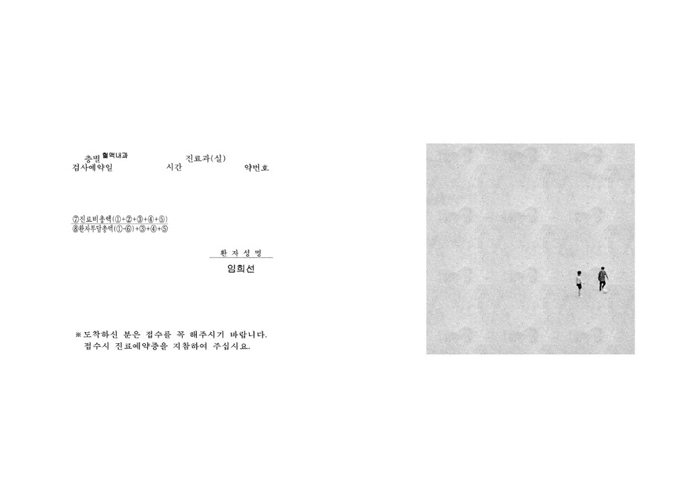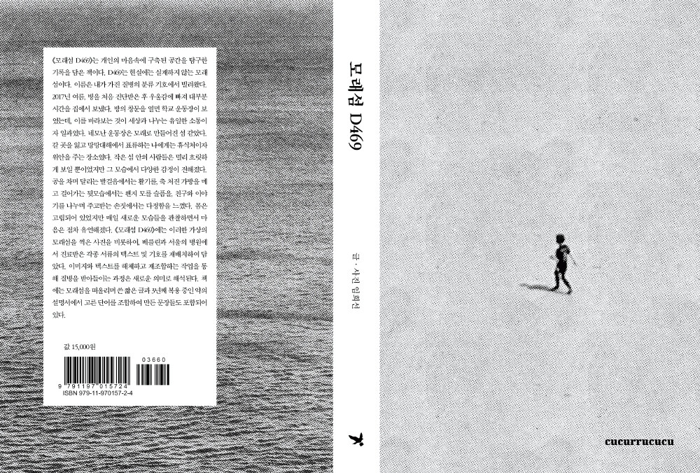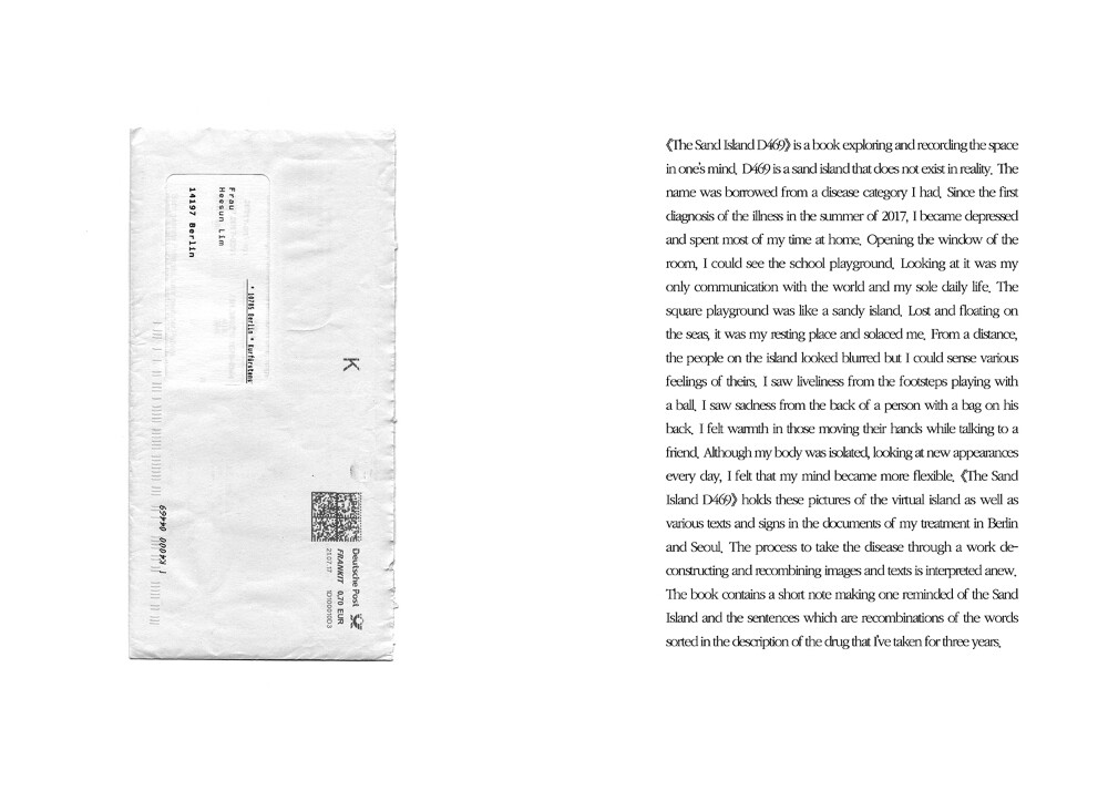 《모래섬 D469》는 개인의 마음속에 구축된 공간을 탐구한 기록을 담은 책이다. D469는 현실에는 실재하지 않는 모래섬이다. 이름은 내가 가진 질병의 분류 기호에서 빌려왔다. 2017년 여름, 병을 처음 진단받은 후 우울감에 빠져 대부분 시간을 집에서 보냈다. 방의 창문을 열면 학교 운동장이 보였는데, 이를 바라보는 것이 세상과 나누는 유일한 소통이자 일과였다. 네모난 운동장은 모래로 만들어진 섬 같았다. 갈 곳을 잃고 망망대해에서 표류하는 나에게는 휴식처이자 위안을 주는 장소였다. 작은 섬 안의 사람들은 멀리 흐릿하게 보일 뿐이었지만 그 모습에서 다양한 감정이 전해졌다. 공을 차며 달리는 발걸음에서는 활기를, 축 처진 가방을 메고 걸어가는 뒷모습에서는 왠지 모를 슬픔을, 친구와 이야기를 나누며 주고받는 손짓에서는 다정함을 느꼈다. 몸은 고립되어 있었지만 매일 새로운 모습들을 관찰하면서 마음은 점차 유연해졌다. 《모래섬 D469》에는 이러한 가상의 모래섬을 찍은 사진을 비롯하여, 베를린과 서울의 병원에서 진료받은 각종 서류의 텍스트 및 기호를 재배치하여 담았다. 이미지와 텍스트를 해체하고 재조합하는 작업을 통해 질병을 받아들이는 과정은 새로운 의미로 해석된다. 책에는 모래섬을 떠올리며 쓴 짧은 글과 3년째 복용 중인 약의 설명서에서 고른 단어를 조합하여 만든 문장들도 포함되어 있다.
