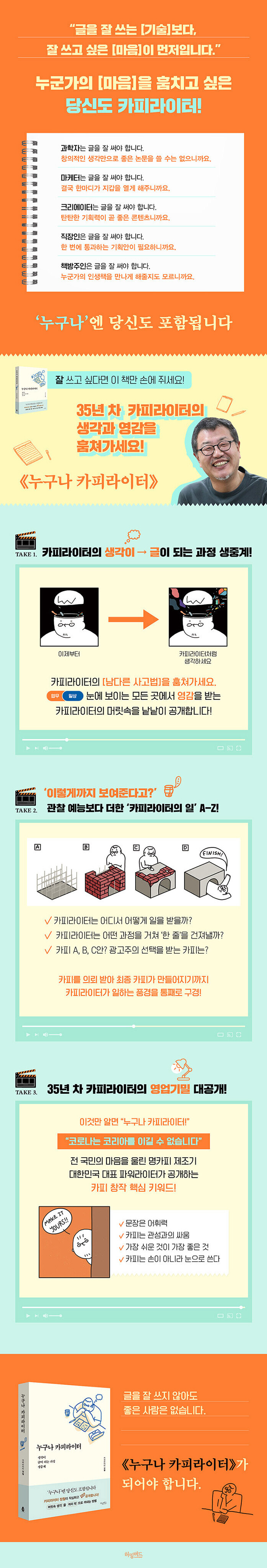 이제 푸근한 매력이 넘치는 카피라이터와 1대 1로 마주앉을 차례다. 그가 일궈 낸 노동의 현장을 편안하게 구경하며 나의 생각도 글로 옮겨 보면 어떨까. 마음만 먹으면 글을 쓸 수 있는 시대. 이제 당신도 카피라이터가 될 수 있다.