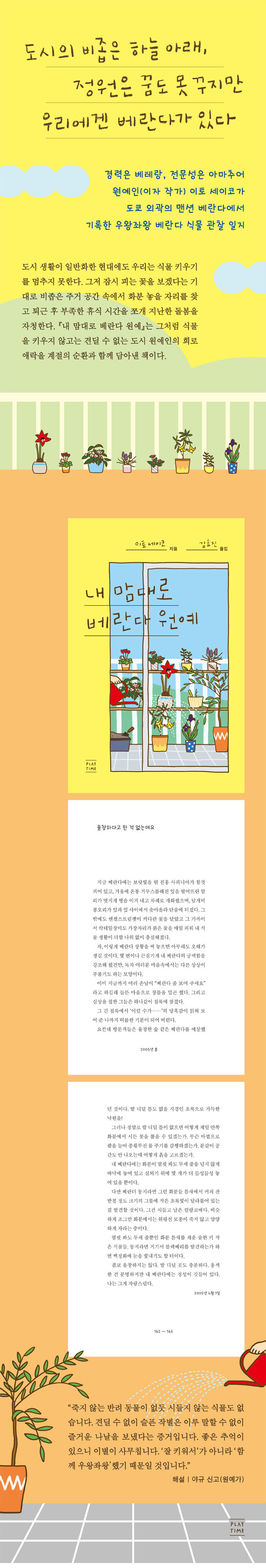 이처럼 이 책은 전문가가 알려 주는 원예의 요령과는 거리가 있다. 오랜 기간 식물과 어울려 산 평범한 도시 생활자의 꾸밈없는 일상을 보여 주고, 그 안에 자연스레 섞여 드는 사색과 유머, 소소한 감동의 순간을 나눌 따름이다.