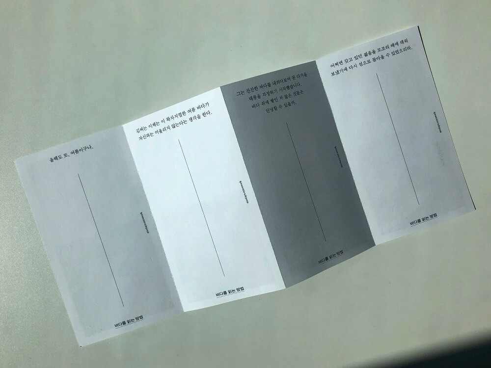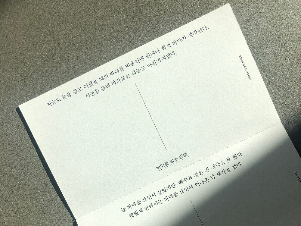 리소 인쇄로 제작되어 독특한 질감과 색감의 바다를 감상하실 수 있습니다. 뒷면에는 엽서집의 모티브가 된 책 ‘바다를 읽는 방법’의 문장이 들어있어서 뜯어서 낱장으로 써도 좋고 병풍처럼 펼쳐놓고 봐도 좋고, 또 책상 위에 놓고 봐도 좋고 벽에 붙여 감상해도 좋습니다. horizon 타입과 vertical 타입 두 가지 종류가 있습니다.
