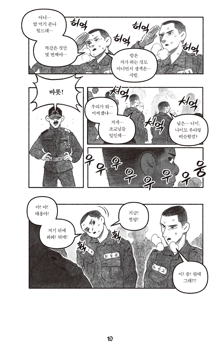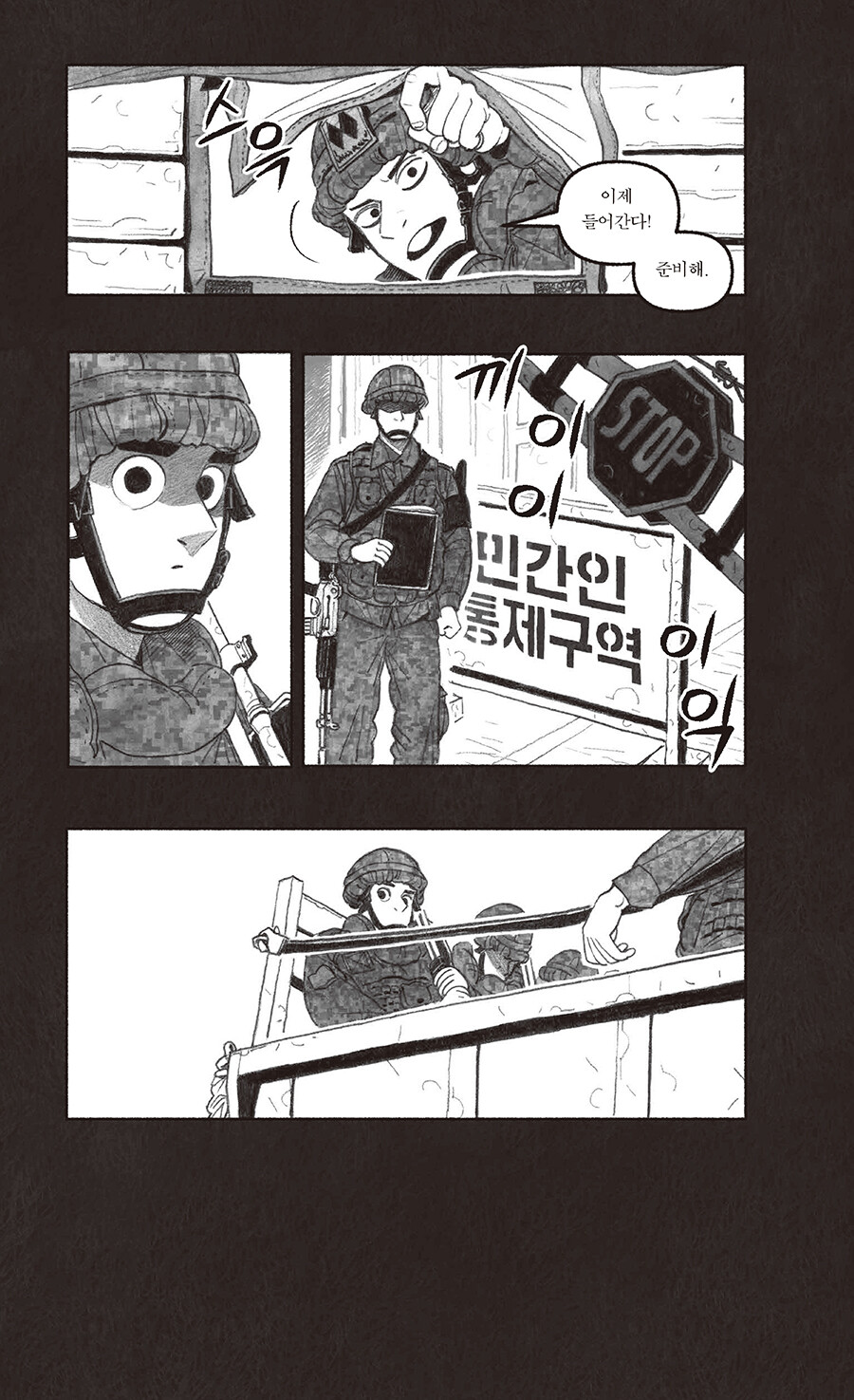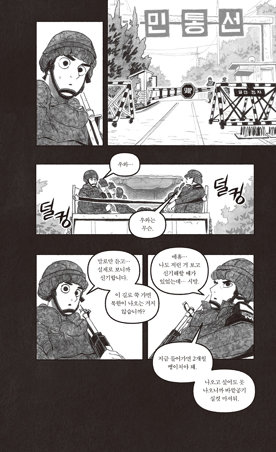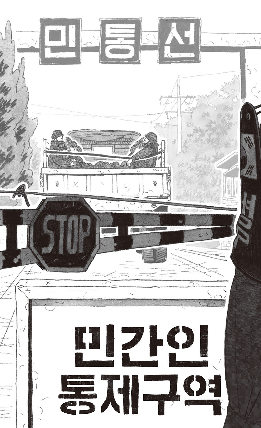 ‘민간인통제구역’은 영토를 다룬 개념어지만, ‘내 안의 보통 사람을 통제하는 구간’으로 읽히고도 남는 이 만화를 읽고 있자면… 이병이 일병 되고, 병장은 짐 챙기는, 속절없이 달아나는 세월의 고속도가 간절해진다. 그러나 스크롤을 흘려보내듯이 내리기에는, 연필 꾹꾹 눌러 그려진 인물들에게 실린 착실한 무게에 마음이 갔고, 웹 기반 만화를 지면으로 옮긴다는 분수 넘는 프로젝트가 덜컥 시작됐다. 이 책 덕분에 엿볼 일도 엿들을 일도 없던 군생활은 물론 Z의 은어를 상당수 배웠다. 은어는 무릇 해당 구성원이 아니면 알아듣지 못하는 게 맛이지만, 모르면 모르는 대로 넘어갈 리 없는 독자의 데이터를 아껴드릴 겸 몇 개의 주석을 달아두었다. 이곳 인물들이, 머잖아 칸의 테두리를 넘고 홈통을 건너 페이지 바깥으로 벗어나오는 미래를 가늠해본다.