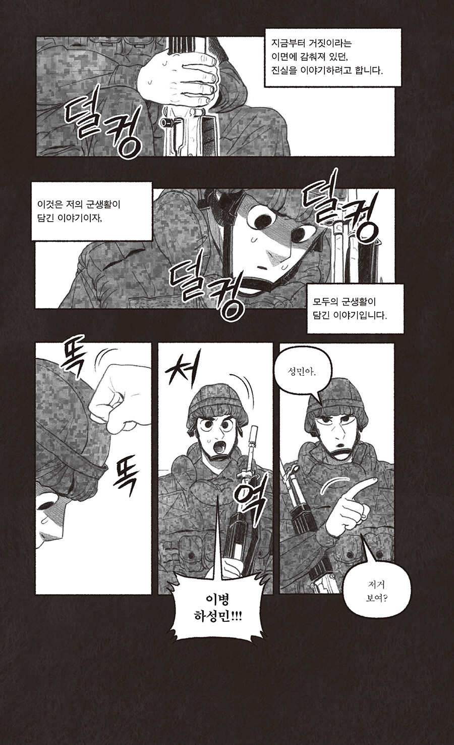 “저는 오늘 큰마음을 먹고 책상 앞에 앉았습니다. 지금부터 거짓이라는 이면에 감춰져 있던, 진실을 이야기하려고 합니다. 이것은 저의 군생활이 담긴 이야기이자, 모두의 군생활이 담긴 이야기입니다.”