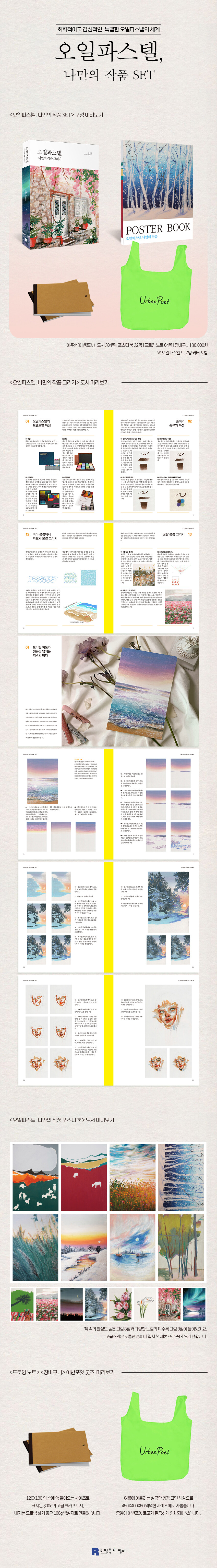 오일파스텔 드로잉 북 <오일파스텔, 나만의 작품 그리기>과 함께 드로잉 북 속 완성도 높은 그림 8점과 드로잉 북 속 그림과는 또 다른 분위기의 미수록 그림 8점을 포스터 북으로 제작하였다. 오일파스텔 드로잉의 색감과 질감이 자연스러우면서도 고급스럽게 표현되는 160g의 도톰한 종이를 엽서 책 제본으로 엮어서 쉽게 뜯어 쓸 수 있도록 제작되었으며 A4 사이즈로 활용도가 높다.