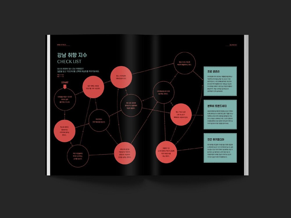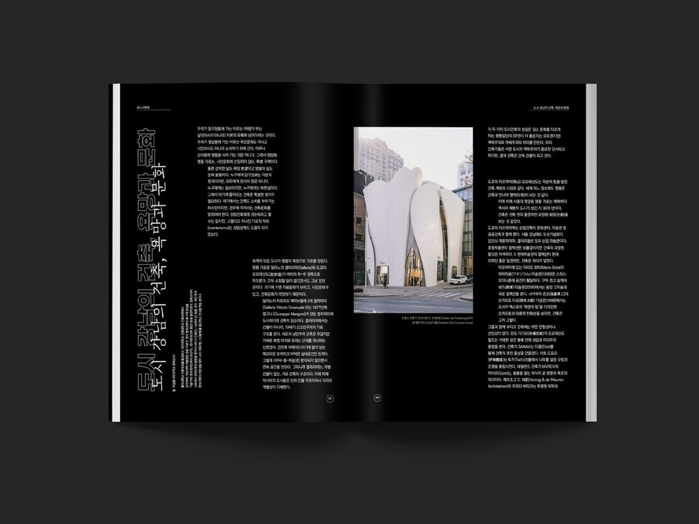 이번 《아는강남》의 경우 이 지역을 이해하는 시작점으로 특별히 두 가지의 테마를 제시합니다. 강남역부터 삼성역까지 이르는 오피스타운 일대는 '워커스 랜드(Worker's Land)', 트렌드세터들의 집결지로 불리는 신사, 압구정, 청담동 일대는 '디자이어링 원더랜드(Desiring Wonderland)'. 강남 일대의 라이프스타일을 압축적으로 표현한 두 가지의 테마 중 본인에게 좀 더 흥미로운 쪽을 먼저 선택하여 강남의 다양한 면면을 살피는 재미가 있습니다.