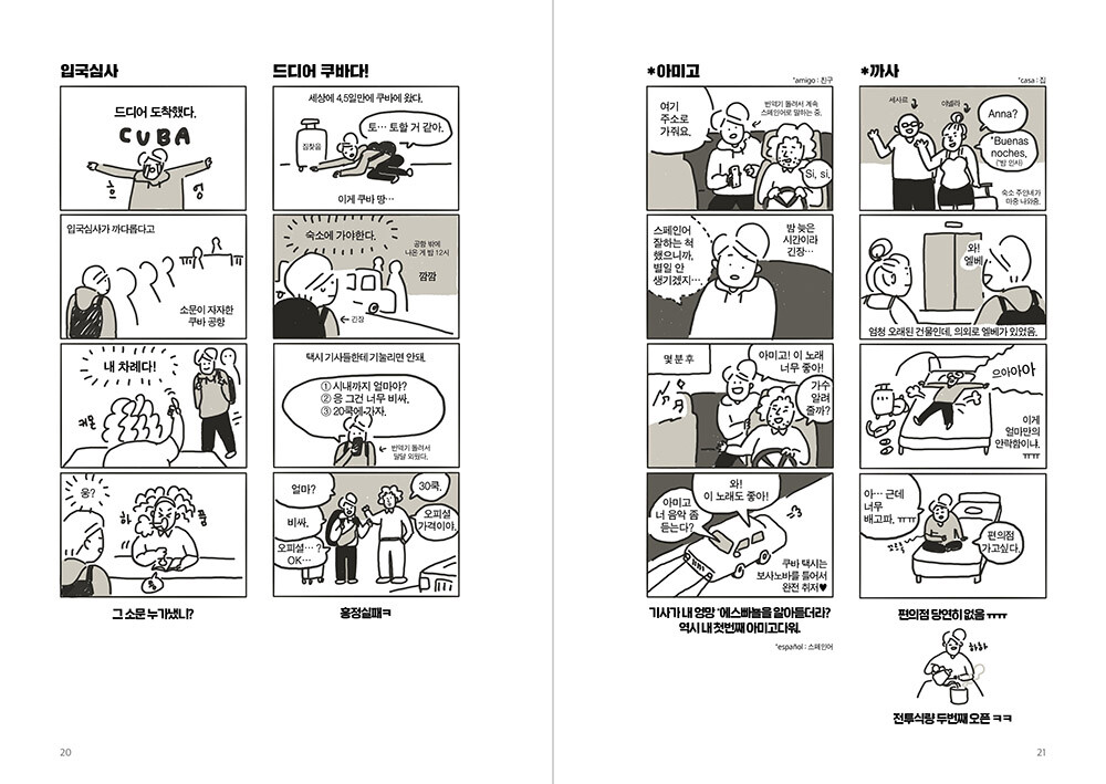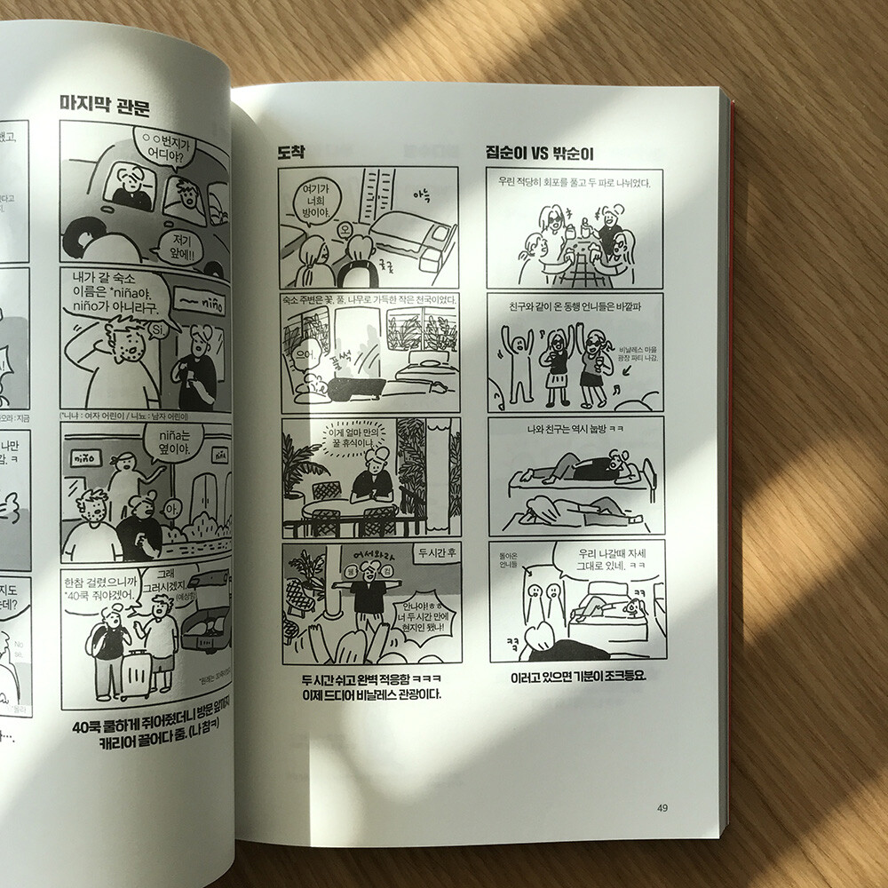 우연히 인터넷에서 허안나 작가의 남미요양기를 보게 되었다. 제목을 본 순간 이미 반쯤 사랑에 빠졌고 결국 연재 내내 업로드를 기다리며 씹고 뜯고 맛보는 시간을 가졌다. 여기 또 있구나! 그 시간과 돈과 노력을 들여 그 먼 남미까지 가서 방에서 행복을 느끼는 사람이! 여행을 사랑하는 모든 집순이에게 이 책을 강력히 추천한다. 우리의 모순에 건배!