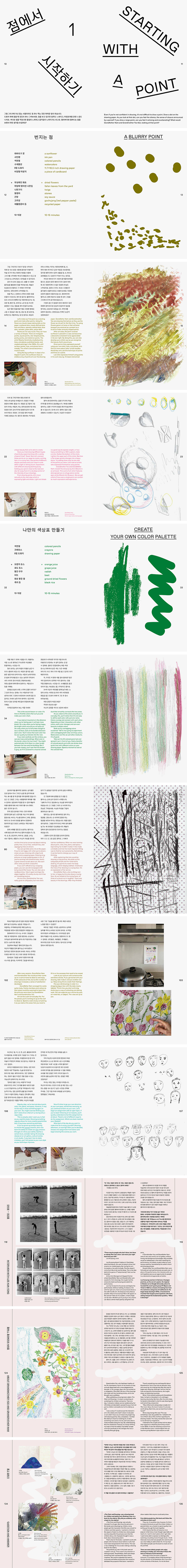 부담 없이 일단 시작하는 것이 가장 중요하다고 말하는 저자는 할아버지, 할머니가 양손을 편하게 움직여 보도록 유도한 후 점, 색, 선, 면 공간으로 개념을 확장해가며 자신만의 개성을 발견하는 동시에 그리는 기술을 자연스레 익히도록 이끈다. 전형 적인 미술도구와 더불어 주변에서 흔히 보지만 미술과 연관 짓기는 어려운 의외의 재료들을 사용해 ‘점’찍기부터 작업을 시작한다. 반려 식물 또는 꽃을 붓으로 사용 해 번지기 기법 등을 소개하는 식인데 이처럼 색다른 시도에서 탄생한 ‘점’은 깊은 울림을 전하며 현대미술에 쉬이 접근하도록 돕는 마중물이 된다.