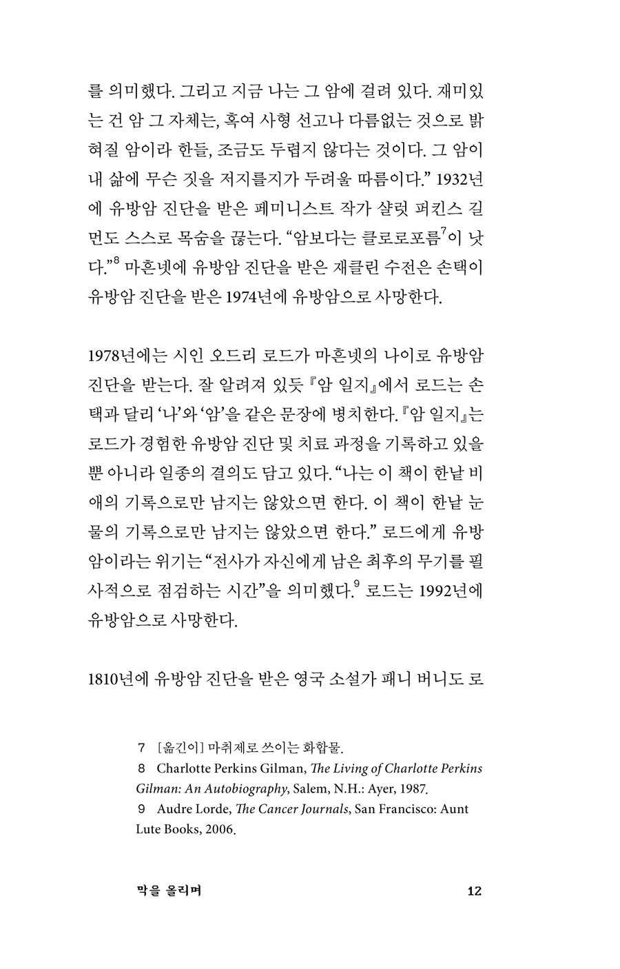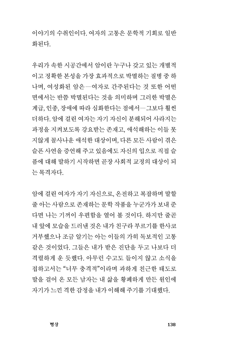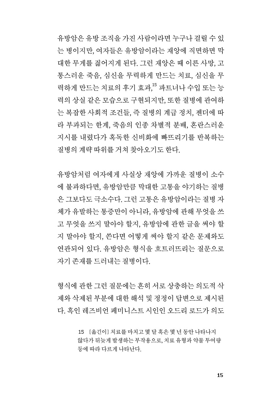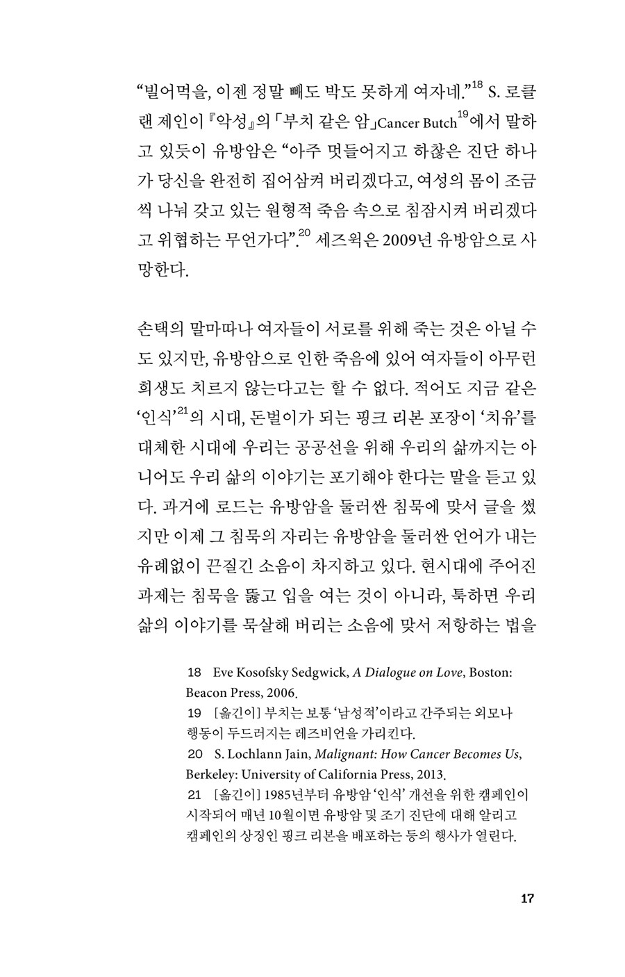 앤 보이어에게 자본주의와 가부장제, 인종주의는 줄곧 중요한 주제였기에(그는 스스로를 공산주의자이자 페미니스트라고 소개합니다), 개인적인 고통을 바깥 세상과 연결하고 비판과 시적 언어를 결합하는 그의 시도는 독특하고도 절박하며 무엇보다 통렬합니다. 그리고 그것은 “질병과 미국 자본주의의 암 돌봄이 얼마나 잔인한지 보여 주는 품위 있고 잊지 못할 서사”라는 평가와 함께 이 책이 2020년 퓰리처상 논픽션 부문에 선정된 이유기도 할 것입니다.