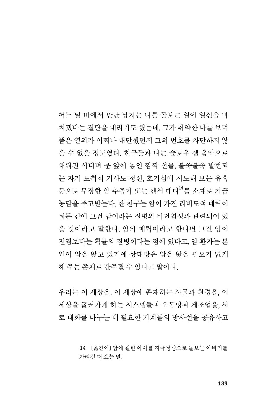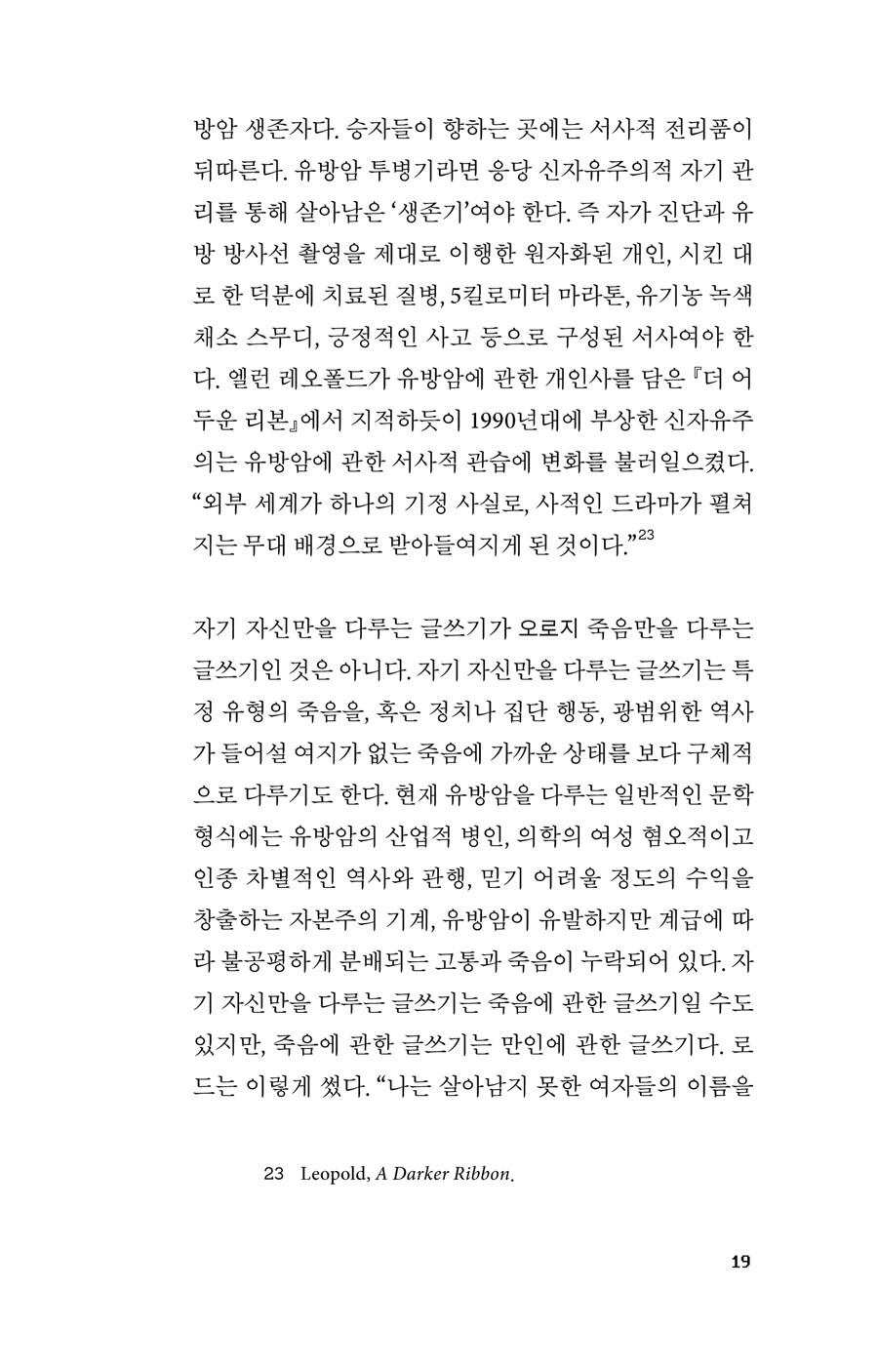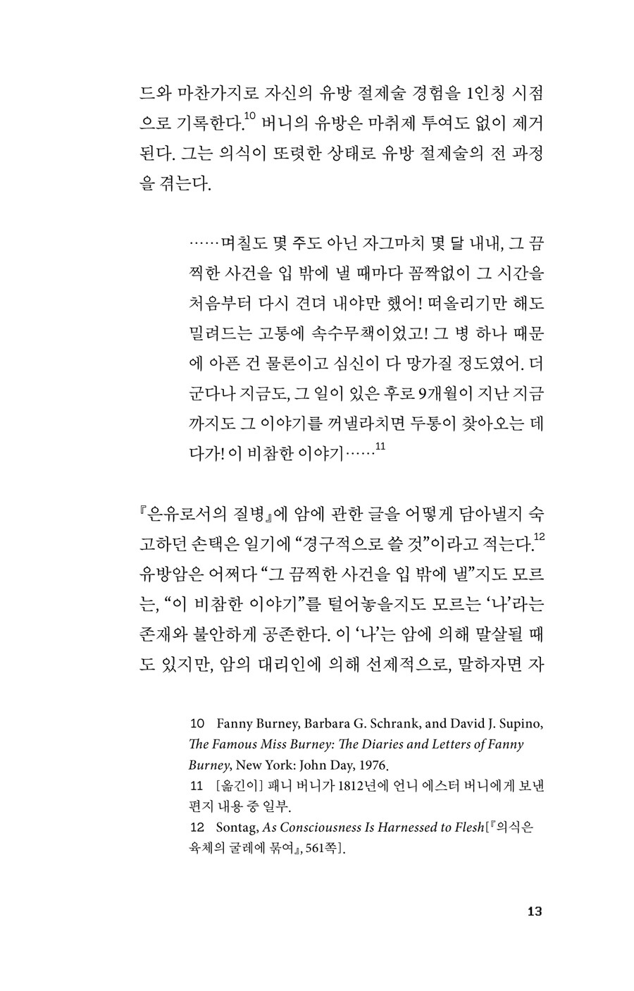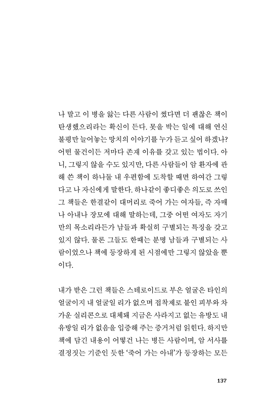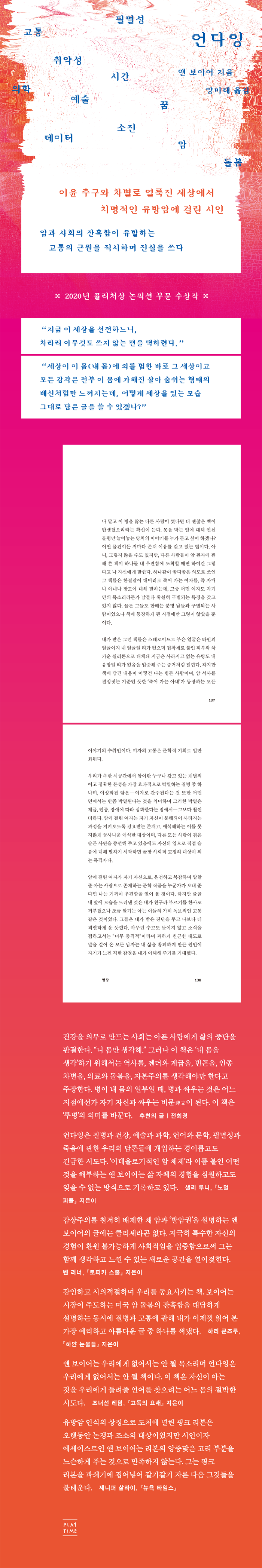 앤 보이어에게 자본주의와 가부장제, 인종주의는 줄곧 중요한 주제였기에(그는 스스로를 공산주의자이자 페미니스트라고 소개합니다), 개인적인 고통을 바깥 세상과 연결하고 비판과 시적 언어를 결합하는 그의 시도는 독특하고도 절박하며 무엇보다 통렬합니다. 그리고 그것은 “질병과 미국 자본주의의 암 돌봄이 얼마나 잔인한지 보여 주는 품위 있고 잊지 못할 서사”라는 평가와 함께 이 책이 2020년 퓰리처상 논픽션 부문에 선정된 이유기도 할 것입니다.