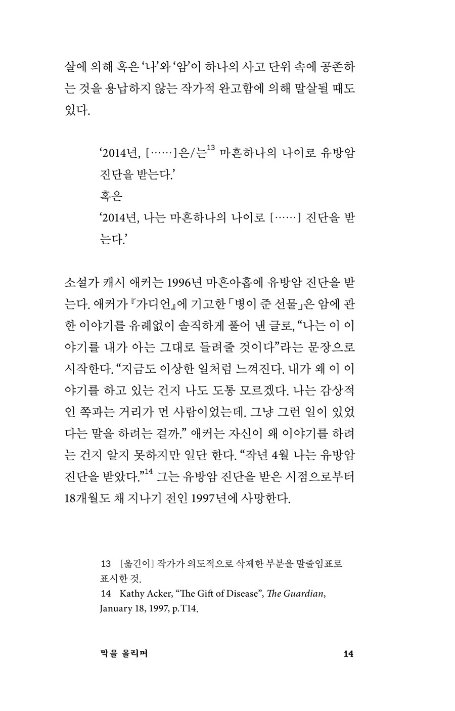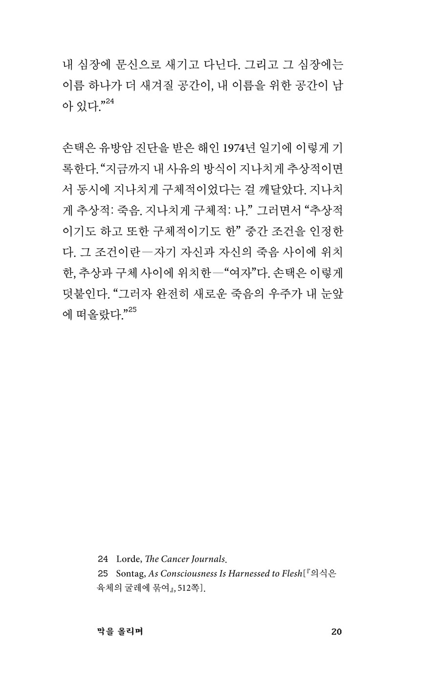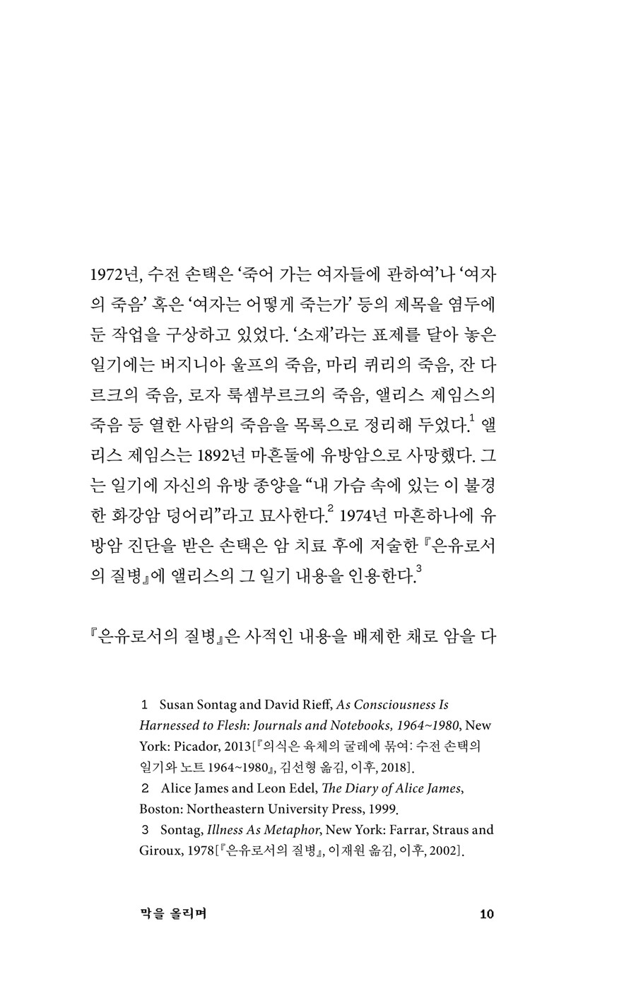 또한 이 책은 출간 후 “뛰어난 유방암 회고록들을 스펙트럼으로 분류할 때 수전 손택의 글이 가장 덜 개인적이고 이브 코소프스키 세즈윅의 글이 가장 개인적이라면, 『언다잉』 은 스펙트럼 전체를 아우른다”는 평가를 얻기도 했는데, 서문 「막을 올리며」를 통해 지은이가 이 책을 어떻게 자리매김하고자 하는지를 확인할 수 있습니다.