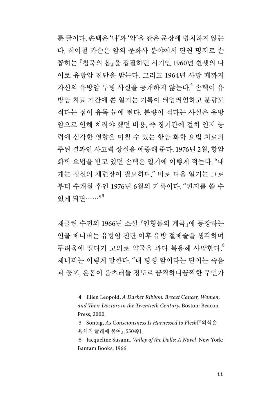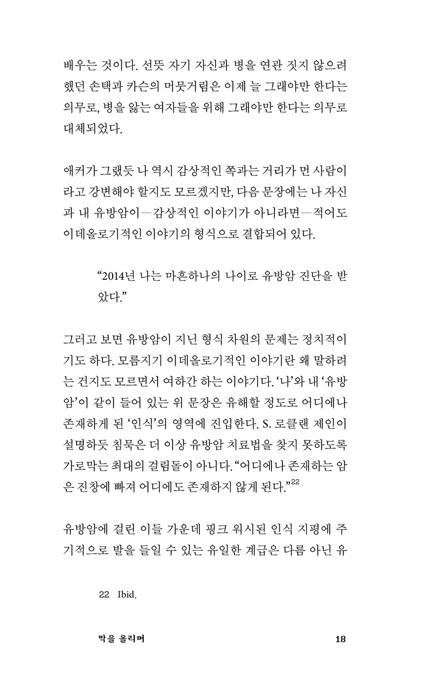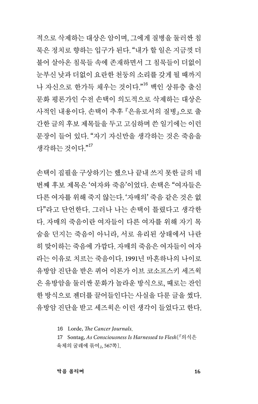 『언다잉』은 장르를 특정 짓기 어려운 책입니다. 수기의 성격만이 아니라 비판과 고발의 성격도 가지고 있고 산문의 한계를 넘어 시적 언어를 향하는 낯선 형식의 실험이기도 합니다. 그러나 그 바탕에는 고통을 침묵시키고 개인화·상품화하는(핑크빛으로 치장하는 캠페인과 전형화된 승리 서사의 범람이 보여 주듯) 세상에 맞서 문학의 진실과 아름다움을 회복시키고 “자매의 죽음”을 애도하며 고통의 연대를 제안하려는 의지가 존재합니다.
