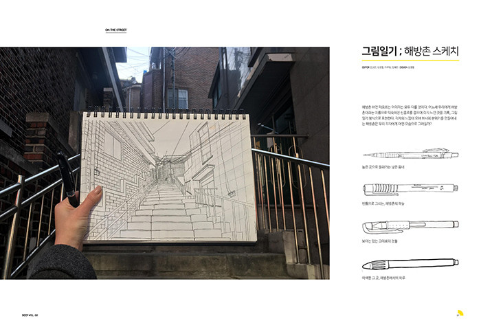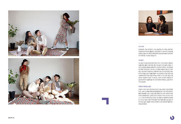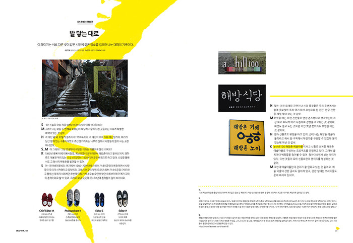 매거진 딥은 기획, 취재, 사진, 디자인팀 모두 대학생으로 이루어져 있습니다. 각각의 전공은 건축, 시각디자인, 패션디자인, 영화, 국어국문, 철학, 경영 등으로 다양합니다. 제각기 다른 공부를 하고 다른 생각을 하는 26명의 대학생이 하나의 길에 모여 하나의 책을 만들게 되었습니다.