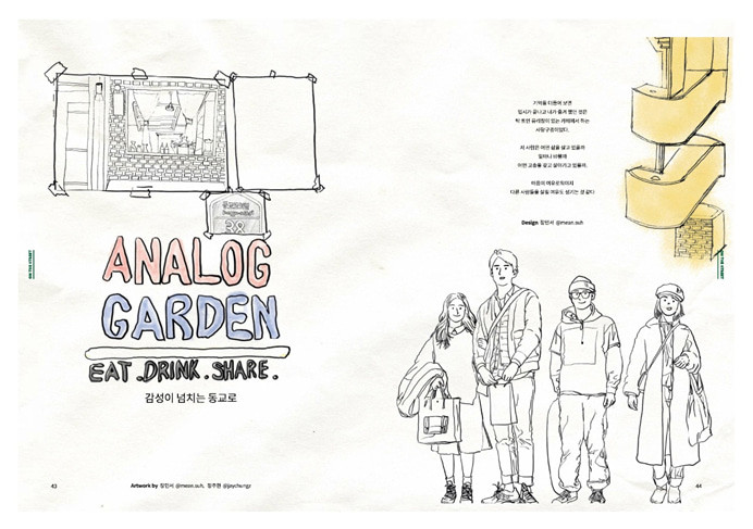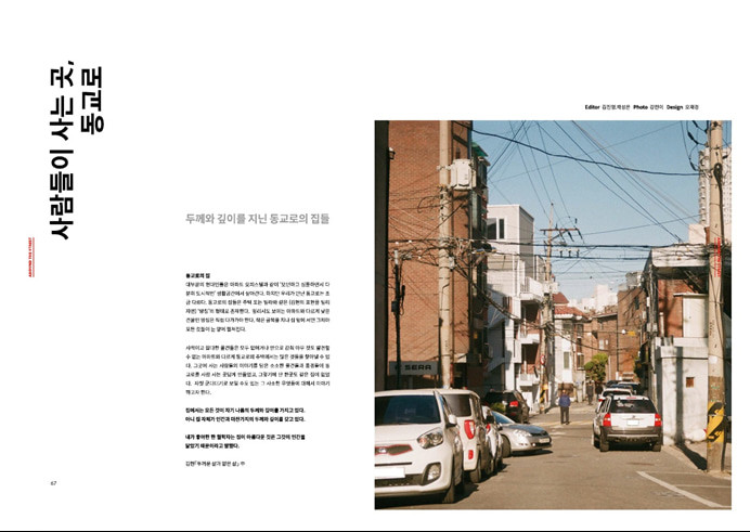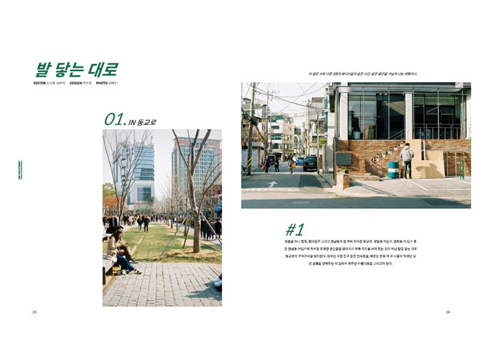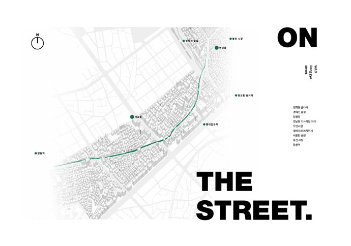 천천히 주위를 둘러보며 걸어본 동교로는 여러 결을 가지고 있었습니다. 붐비는 사람들 사이를 걷기도 하고, 조용한 주택가 사이에서 만날 수 있는 다양하고 깊은 이야기를 담으려 노력했습니다.