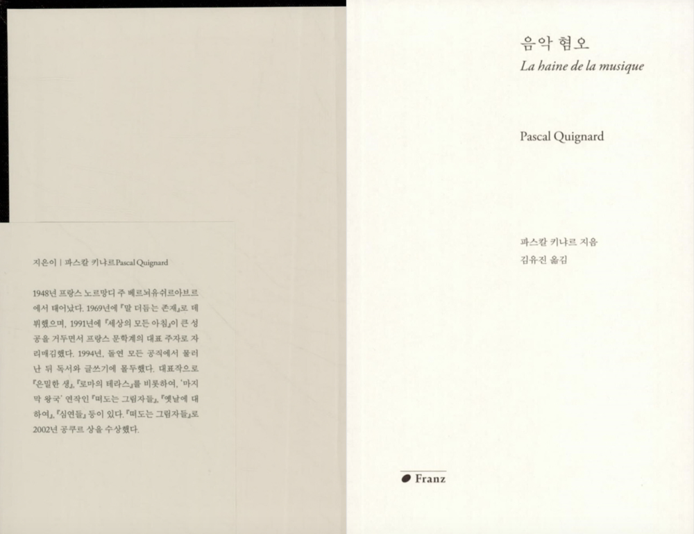 『음악 혐오』는 문학, 역사, 철학, 신화, 예술 등을 폭넓게 넘나들며 고유한 문학적 영토를 일구어 온 파스칼 키냐르 Pascal Quignard(1948∼ )가 음악의 시원과 본질을 탐색한 작품이다. 음악에 대한 전면적인 거부처럼 들리는 이 책의 제목은 보는 이에게 본능적인 당혹감을 준다. 그는 대대로 음악가를 배출한 집안에서 자랐고 그 자신 역시 뛰어난 첼리스트이자 작곡가로도 활동했다. 게다가 이보다 5년 앞서 발표하여 평단과 대중으로부터 고른 지지를 받은 『세상의 모든 아침』에서는 바로크 음악의 아름다움을 선보였던 그이기에 의문은 더 커진다.