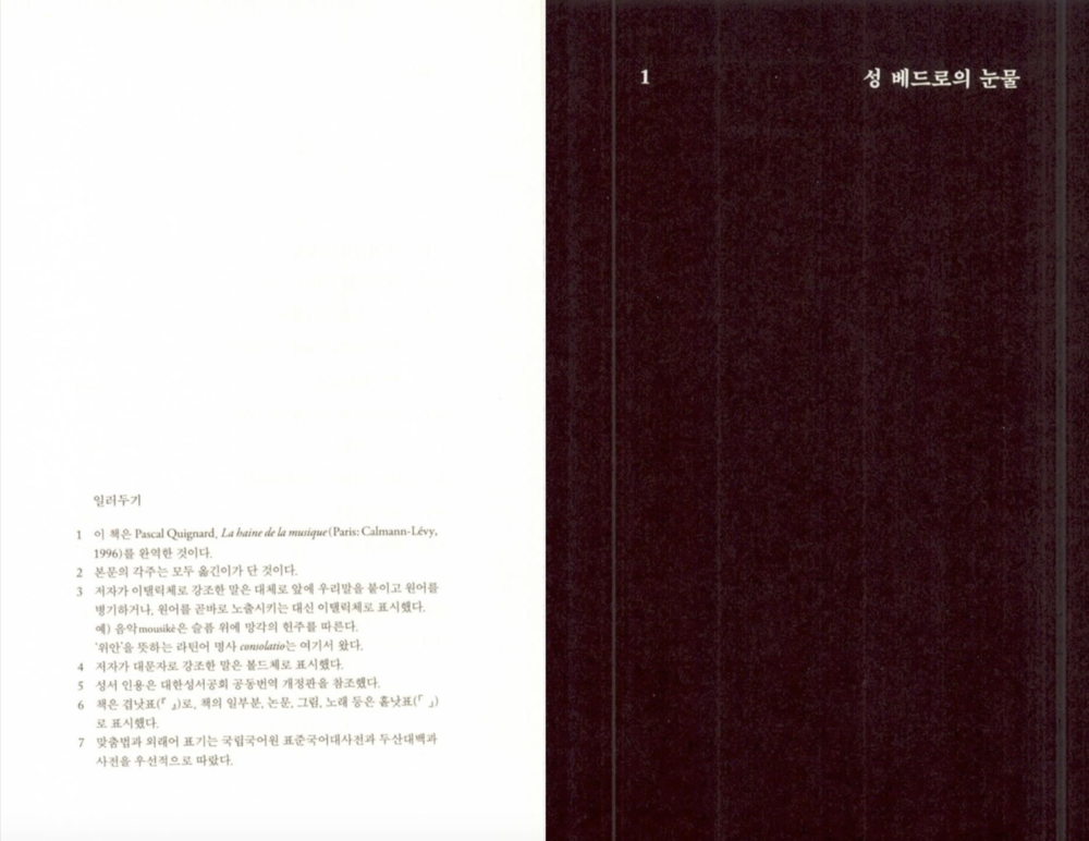 키냐르의 음악 증오는 그가 줄곧 보여 준, 뿌리 뽑힌 현재에 대한 근본주의적 부정의 맥락 안에서 이해할 수 있을 듯하다. 특히 당대에 들어와 비약적으로 증폭된 음악의 오남용 사례는 그로 하여금 음악의 본질을 되짚어 보게 한다(가령 나치가 유대인들을 학살하면서 음악을 이용한 일은 음악이 어떻게 현실의 타락과 인간의 노예화에 일조할 수 있는지를 보여 준 극단적 사례다). 키냐르가 다루는 대상이 무엇이든 결국 문명의 흔적조차 없는 가장 먼 과거로 수렴되었듯이, 이 작품에서도 그는 최초로 소리가 발현된 곳으로 거슬러 올라감으로써 음악의 원형을 제시한다. 마치 땅속에 묻혀 있는 태고의 음향적 부스러기들을 파내어 그것에 담겨 있는 마음을 읽으려는 듯이. 혹은 되찾을 수는 없지만 사라진 선율들을 어렴풋이 떠오르게 하려는 듯이.