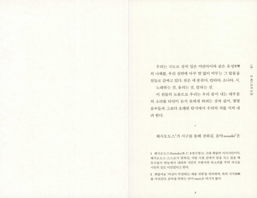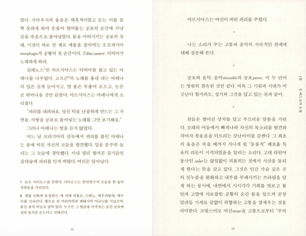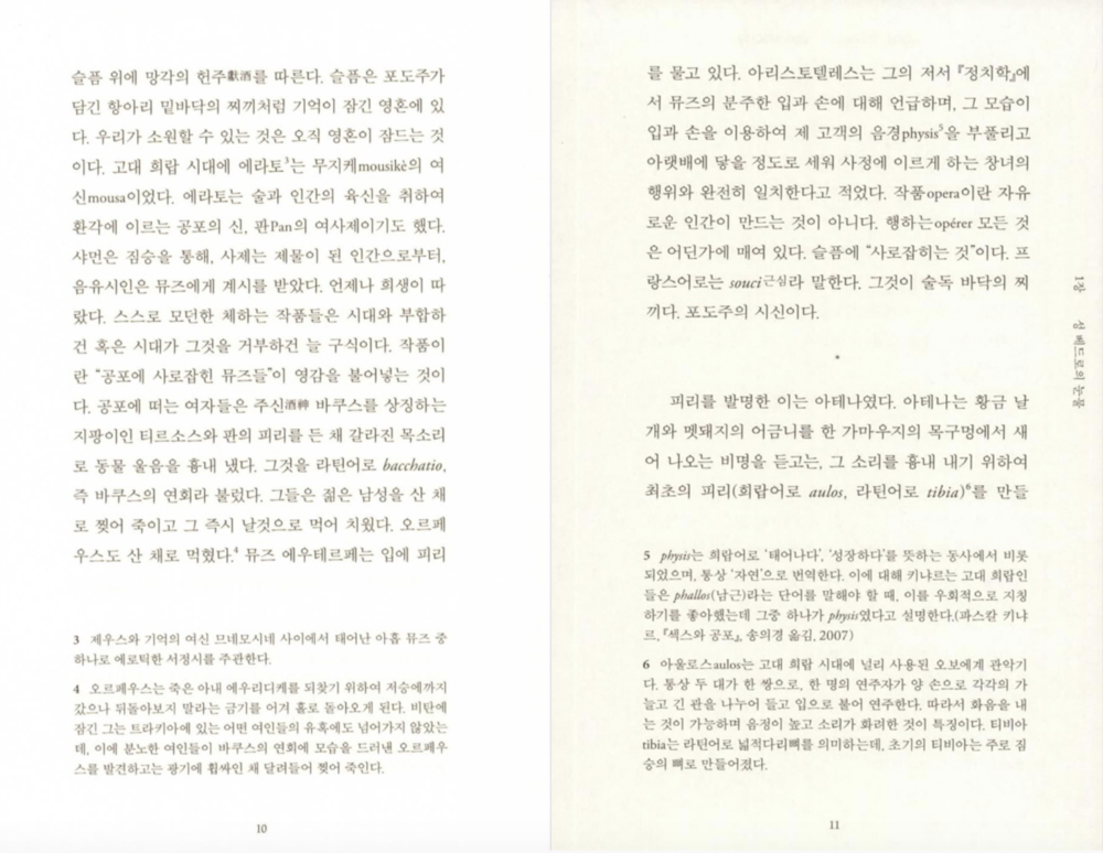 - 공포와 음악. 음악mousike과 공포pavor. 이 두 단어는 영원히 결속된 것만 같다.(13쪽)