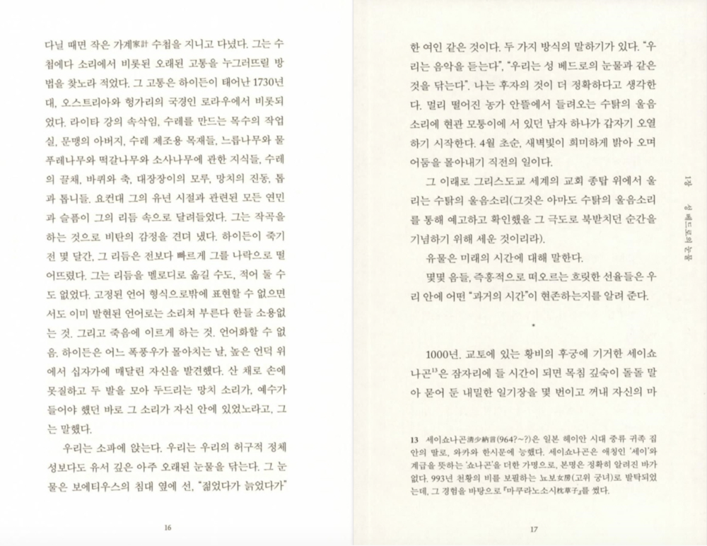 - 나는 소리가 주는 고통과 음악의 지속적인 관계에 대해 질문해 본다.(13쪽)
