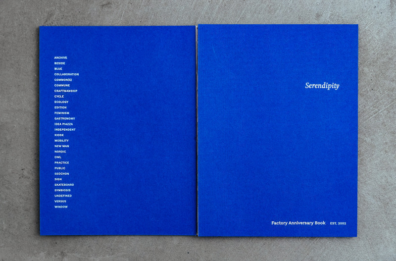물리적으로 같은 장소이지만 일터이자 실험실, 놀이터, 교실, 주방, 시장 등으로 때때로 변신하는 팩토리는 언제나 변화하기도 하고, 늘 변치 않기도 합니다. 우리의 삶이 주기적으로 반복되는 일상과 새로운 시도로 교차되어 짜여 있듯이 말입니다. 아울러 팩토리에서 직간접적으로 무언가를 함께 했던 친구들을 헤아려 보니 700여 명을 훌쩍 넘습니다. 그리고 팩토리와 그 무언가를 공유했던 이들은 헤아릴 수조차 없습니다. 전시를 본 관람객, 출판물을 읽은 독자, 에디션을 구입한 고객, 심지어 매일 팩토리의 쇼윈도 앞을 지나가는 행인까지. 팩토리는 저마다 각자의 자리에서 자신만의 고요한 고양을 키우고 있는 개인들이, 예술이라는 큰 언어 속에서 계속해서 다양한 모습으로 만나 관계들을 만들어 내고, 그 관계의 변주 속에서 자신의 영역과 공동의 영역을 팩토리를 오가며 안팎으로 다이내믹을 만들고 확장하는 곳입니다. 그리고 이러한 확장은 다시 일상과 삶으로 고스란히 수렴됩니다. 이 책이 또 어느 누군가의 손에, 책장에 가닿아 우리가 예상치 못한 또 다른 삶 속에서 세렌디피티, 뜻밖의 재미와 우연한 기쁨이 되었으면 합니다.