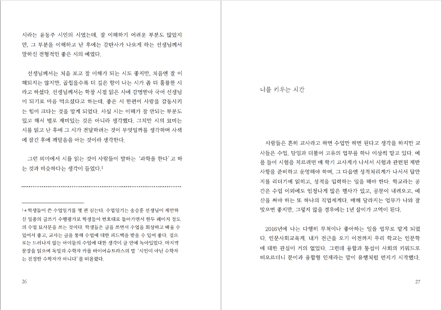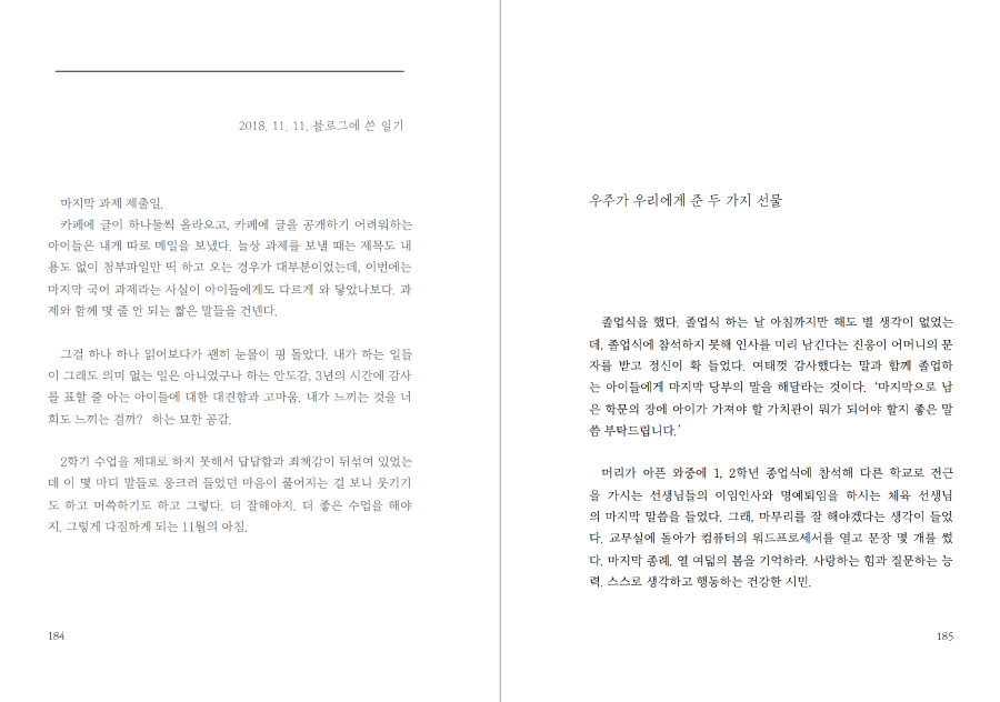 생각해보면 행운이었던 것 같다. 나의 이야기를 귀 기울여 들어주는 친구들을 만난 것이. 학생이자, 친구이자, 스승이었던 나의 아이들. 그 아이들과 울고 웃으며 수업했던 이야기들을 책에 담고 싶었다.