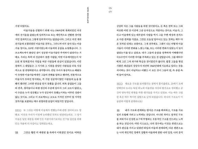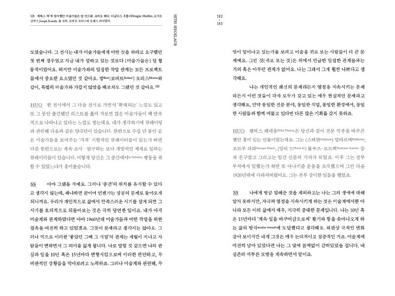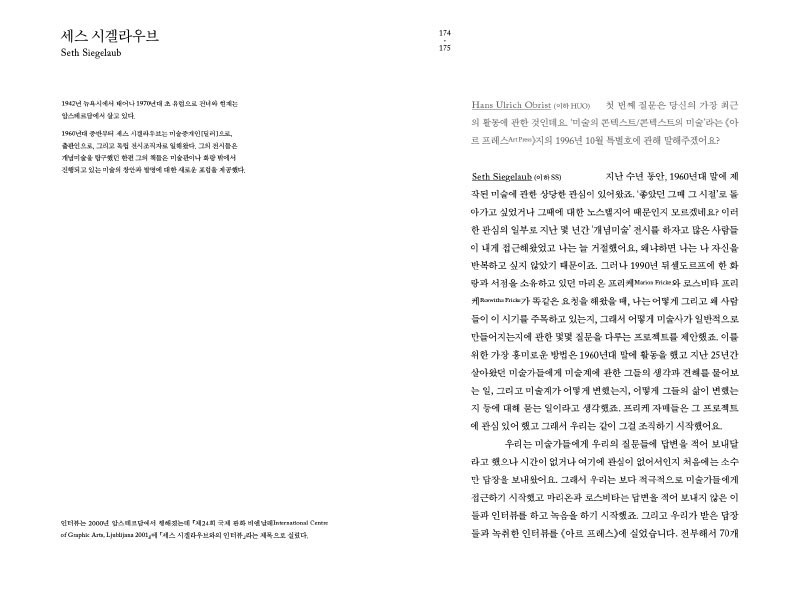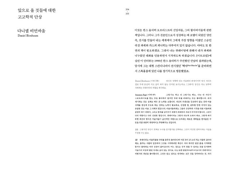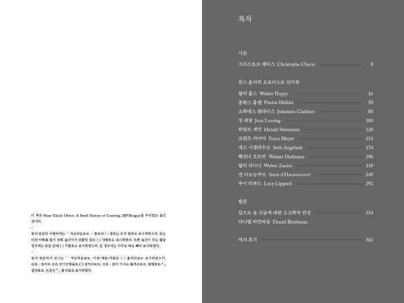 미술 비평가이자 큐레이터로서는 최초로 ‘세계 미술계의 파워 인물 100명’ 중 1위에 선정된 한스 울리히 오브리스트가 전 세계의 저명한 큐레이터들, 월 터 홉스 Walter Hopps, 퐁튀스 훌텐 Pontus Hulten, 요하네스 클라더스 Johannes Cladders, 장 레링 Jean Leering, 하랄트 제만 Harald Szeemann, 프란츠 마이어 Franz Meyer, 세스 시겔라우브 Seth Siegelaub, 베르너 호프만 Werner Hofmann, 월터 자니니 Walter Zanini, 앤 다르농쿠르 Anne d'Harnoncourt, 루시 리파드 Lucy Lippard와 나눈 독특한 인터뷰 모음집이다.