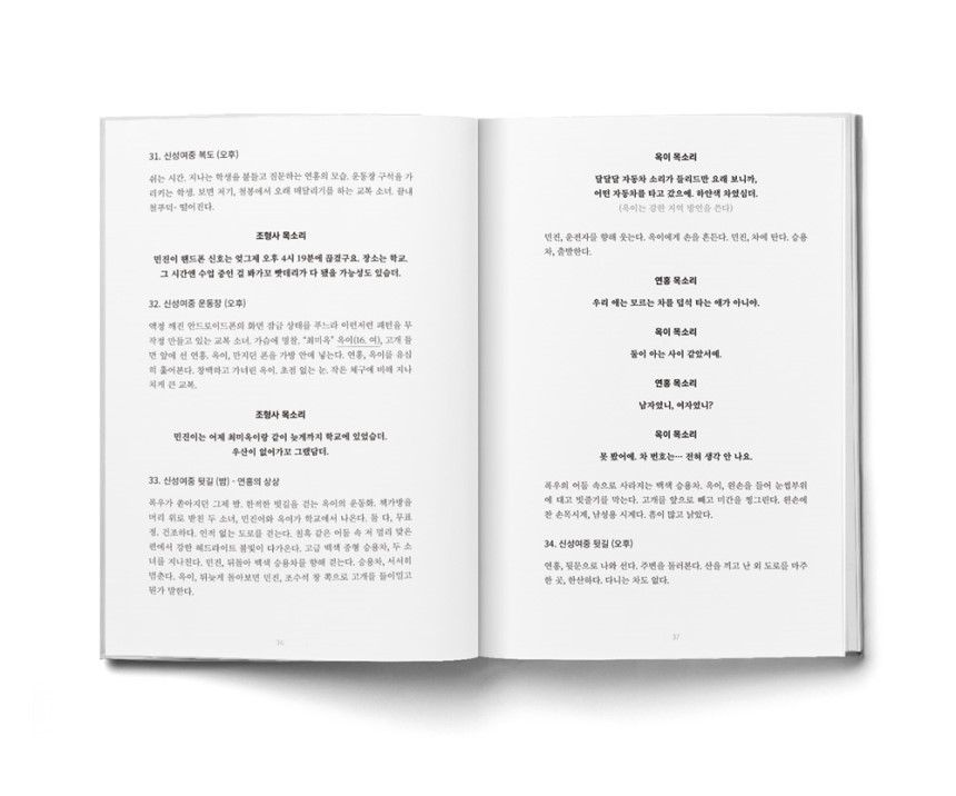 <각본 비밀은 없다>는 영화 촬영에 앞서 완성된 최종교를 발간하여 영상을 서적화하는 것이 아닌, 각본으로서의 특성을 강조했다. 현장과 촬영과 편집과 연기 등 종합적인 영화 산업에 진입하여 최종 영화로 제작되기 전, 각본가에 의해 완결된 문학으로 읽을 수 있다. 또한 편집 시 삭제된 씬들이 남아 있어 다소 다른 엔딩, 장면, 대사 역시 확인 가능하다. 특정 장면이 스크린 뒤에서 어떻게 지시되고 짜였는지 볼 수 있도록 부록으로 스토리보드(이스라 스토리보드 작가) 중 일부를 발췌해 수록했다.