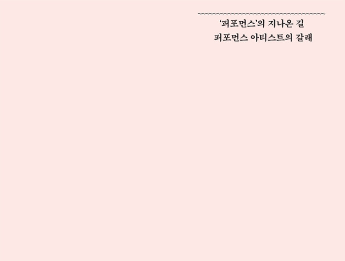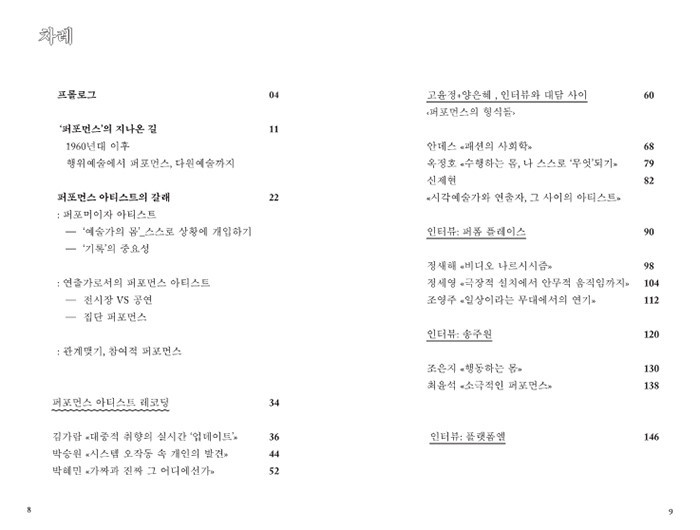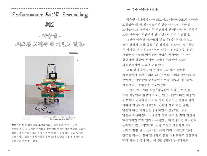 최근 퍼포먼스 아트는 다원예술이나 라이브 아츠 등 다양한 영역으로 확장되어 미술계에서 실험성을 중심으로 등장하고 있다. 이 책에서는 최근 퍼포먼스 아티스트 혹은 영상 작가로 구분되어 오는 작가들의 활동을 개별적인 비평문으로 연구를 진행하고 있다. 김가람, 박승원, 박혜민, 안데스, 옥정호, 신제현, 정새해, 정세영, 조영주, 조은지, 최윤석 총 11명의 각각의 아티스트들은 국내에서 한참 활동을 하고 있는 오늘의 예술가들이다. 이 책에서는 퍼포먼스를 어떻게 정의하느냐보다는 이 각각의 예술가들이 그동안 어떤 활동을해오고 있는지를 재조명하고, 젊은 국내 예술가 특유의 실험성, 젊은 예술가들이 경험하고 주목하는 오늘의 현대 사회에 대해서 함께 공감하고자 하였다. 또한 이 책에서는 퍼포먼스와 관련된 활동을 하고 있는 기획자나 안무가, 공간 등을 인터뷰하여 작가연구만으로 부족한 부분을 채우고자 하였다.