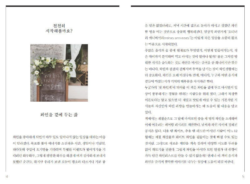 우리가 먹는 음식이나 마시는 음료 중에 어떻게 만들어졌는지 세세하게 설명할 수 있는 것 이 얼마나 될까요? 단순히 재료나 산지가 아니라 품종과 와인이 만들어진 마을 이름까지 알아둬야 하니, 대부분 ‘와인만큼은 뭘 좀 알고 마시고 싶다'는 욕구를 가지고 있고, 저자 또한 와인가게를 운영하며 수많은 질문을 받아왔습니다. 그중에 ‘기본은 알고, 내가 좋 아하는 와인생활을 이어가기’에 도움이 되어줄 상식과 팁을 정리했어요. 와인 테이스팅하는 법, 와인을 고르는 기준, 와인을 마시는 온도와 시음 적기처럼 꼭 알아야 할 기본 지식과 와인 상차림에 어울리는 테이블 스타일링, 남은 와인 보관과 활용법 등 이 기회에 알아두면 도움이 될 정보를 담았습니다.