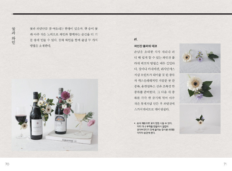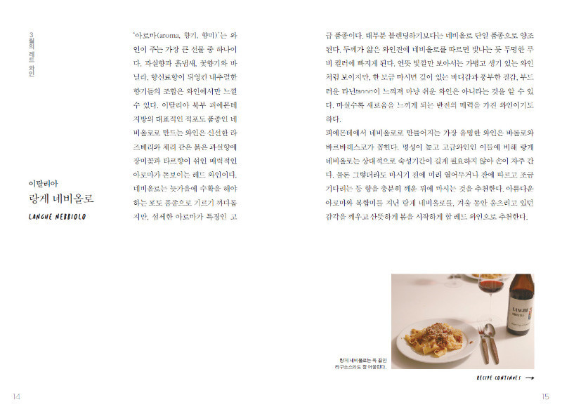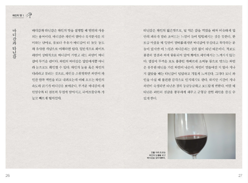 와인을 마시다 보면 빈번하게 벌어지는 일입니다. 가끔 특별히 구입하는 와인이든, 데일리로 마실 와인이든, 입맛에 맞는 것을 고르는 일은 중요하잖아요. 책에서는 각기 다른 스타일의 36가지 레드, 화이트, 스파클링 와인을 계절에 맞게 추천하고 그에 대한 설명과 어떤 특색을 가지고 있는지 소개합니다.
