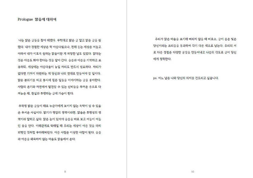 맑음에 대하여 언젠가는 꼭 써야겠다고 생각했습니다. 맑은 마음일 때 우리는 투명하게 즐기고 또 그만큼의 어둠도 마주하게 됩니다.
