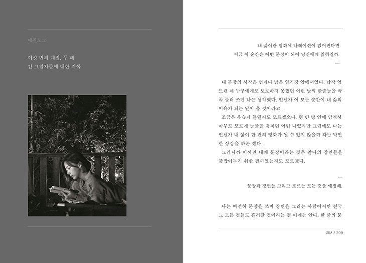 여섯 계절을 지나며 내가 혹은 당신이 지나쳐 왔을 장면들을 기록했다. 순간이라는 시간 속에 머물던 장면들을 놓치지 않기를 바라며. 이 책이 당신의 영화 속 한 켠에 머물 수 있기를 바란다. 그리고 끝나지 않을 러닝타임 가운데 몇 차례 더 넘겨질 수 있기를.