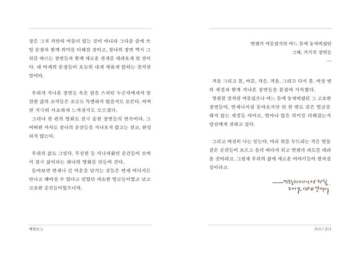 매일의 삶 가운데 우리가 지나온 장면들은 조금도 특별하지 않게 느껴질지 도 모르겠다. 그러나 한 편의 영화도 결국 숱한 장면들의 연속이다. 그 어떠한 서사도 찰나의 순간들을 지나오지 않고서는 완성되지 않는다. 우리의 삶도 그렇다. 무심한 듯 지나쳐왔던 순간들이 모여서 결국 하나의 삶을 만들어 간다. 돌아보면 언제나 긴 여운을 남기는 것들은 언제 어디서든 만나고 헤어질 수 있다고 믿었던 사소한 얼굴들이었고 낮고 고요한 공간이었으니까.
