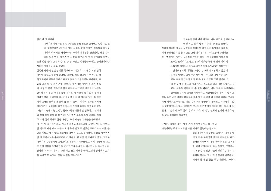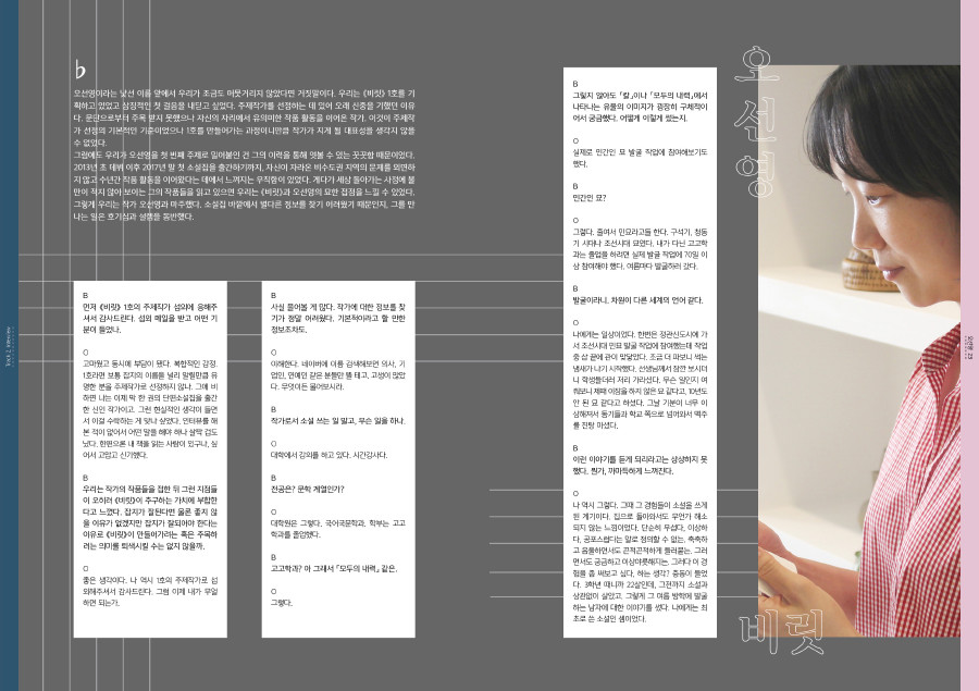 1호의 주제작가는 소설가 오선영이다. 2017년 12월 첫 소설집 『모두의 내력』을 출간한 오선영은 대학의 시간강사로서, 한 가정의 아내이자 엄마로서, 그리고 소설가로서의 삶을 병행해오고 있다. 그의 소설로부터 독자는 한 국사회의 메이저리티와 마이너리티를 구분 짓는 여러 가지 척도에 대한 의심을 감지할 수 있 다. 『비릿』은 인터뷰 트랙을 통해 그러한 오선영 소설의 기원과 방향을 묻는다.