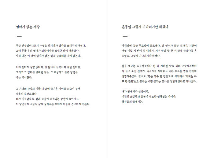 내 가족, 지인, 사랑하는 사람이 교단에 있다면, 혹은 그 분이 교단에 서기를 꿈꾼다면 제 책을 빌려 그분께 용기와 위로를 주셨으면 좋습니다. 여전히 학교는 온기가 남아 있는 곳이라고요. 우리가 잃어버린 ‘희망’, ‘꿈’ 같은 것들을 말하고 생각하는 곳이라고요.