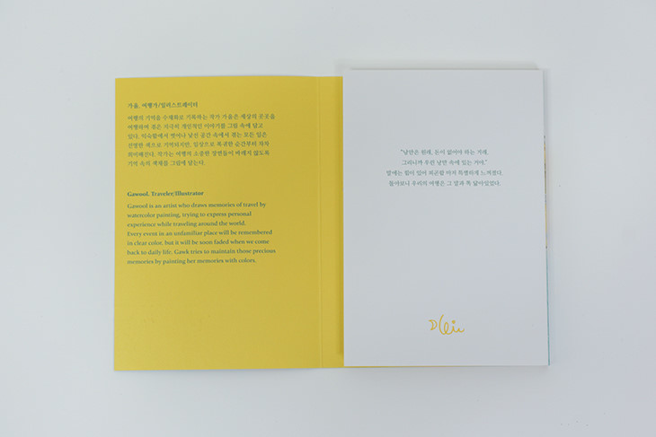 같은 시간과 공간에 함께 머물렀어도 여행은 모두 각자의 방식으로 기억됩니다. ‘가울 여행 엽서집’의 작가 가울은 바로 그런 여행의 주관적인 기억에 집중합니다. 그 시간, 그 장소에 머물렀던 그 순간의 기억. 작가는 특별한 순간의 기억이 바래지 않도록 기억 속의 색채를 수채화 속에 담아냅니다.
