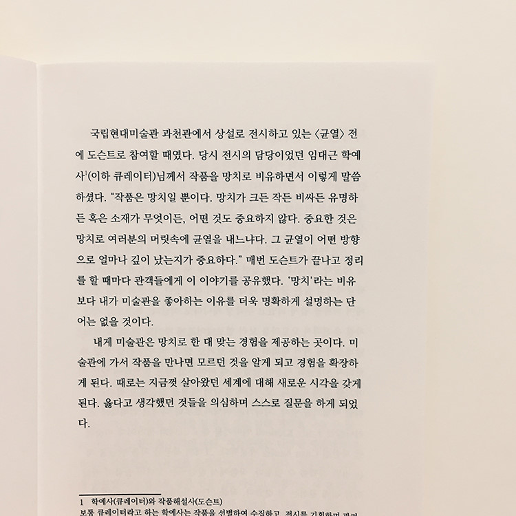미술관을 카페처럼 다니길 좋아합니다. 주말엔 도슨트를 하기도 합니다. 그러니 주변에서 "좋은 전시를 추천해달라" 하기도 하고, "미술을 좋아하고 싶지만 어떻게 시작해야 하는지 모르겠다"고 말하곤 하였습니다.