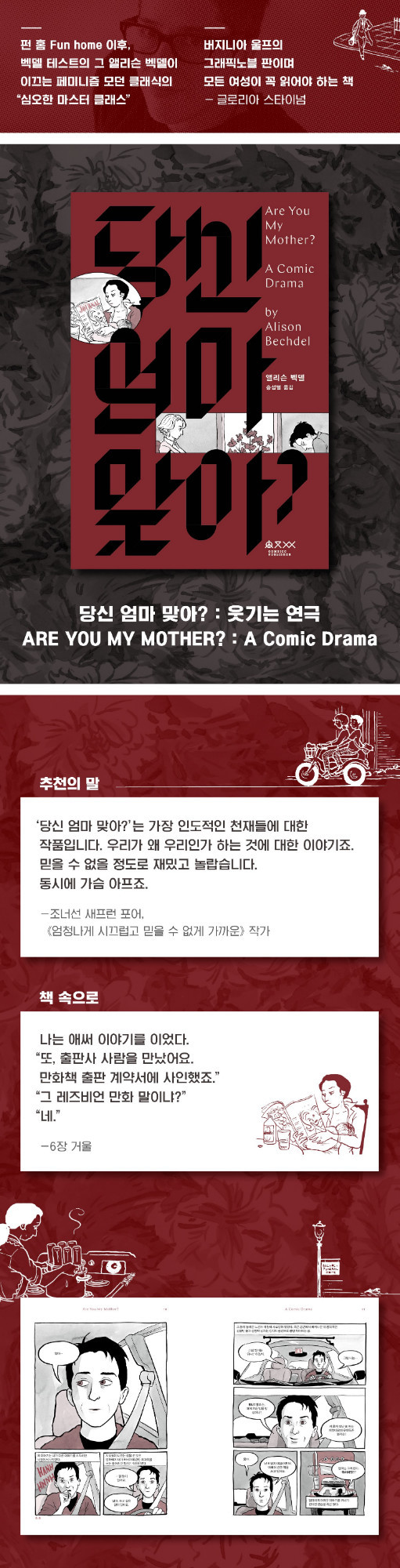 <당신 엄마 맞아? ARE YOU MY MOTHER?>는 <펀 홈>의 연속선상에 있는 자전적 서사이자 현대 여성의 표본인 ‘어머니’에 관한 회고록입니다. 클로짓 게이인 아버지 브루스 벡델의 비밀과 희비극에 가리어진 어머니 헬렌 오거스타, 레즈비언 딸 앨리슨 벡델의 삶과 냉소적인 태도, 은밀한 열정의 교차점에 대해 씁니다. 버지니아 울프, 에이드리언 리치, 실비아 플라스 등의 문학 작품과 수전노, 소야곡, 로얄 패밀리 등의 연극을 비롯해 도널드 위니캇과 앨리스 밀러, 프로이트, 라캉 등의 정신 분석학 개념까지 솜씨 좋게 다룬 유쾌한 문제작입니다.