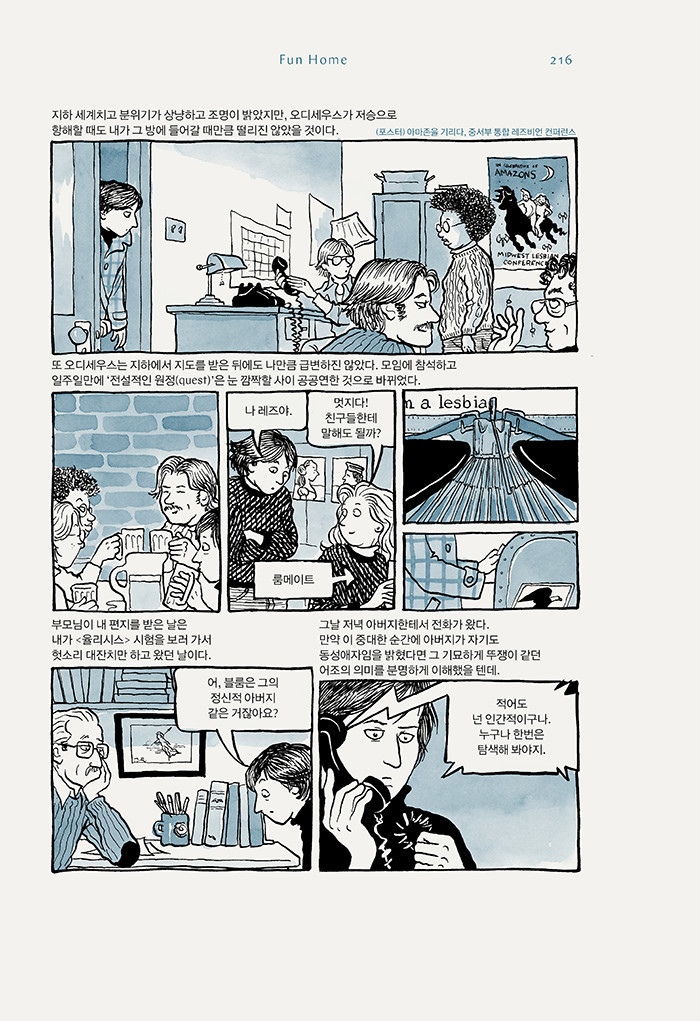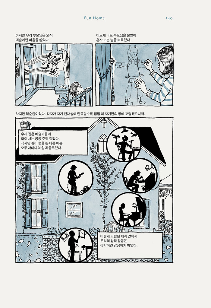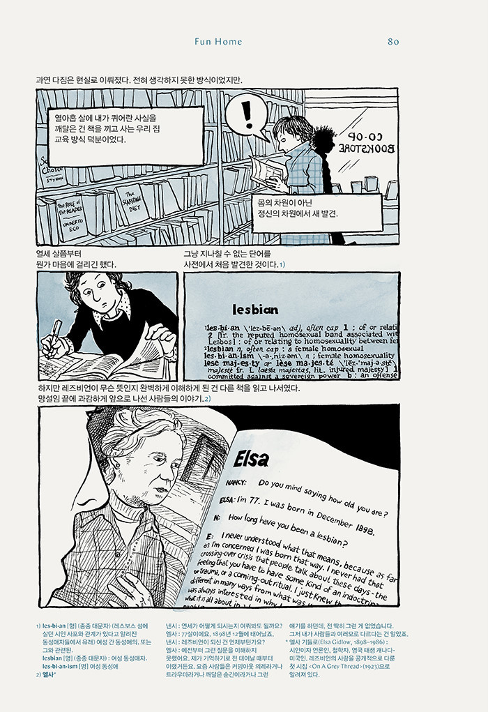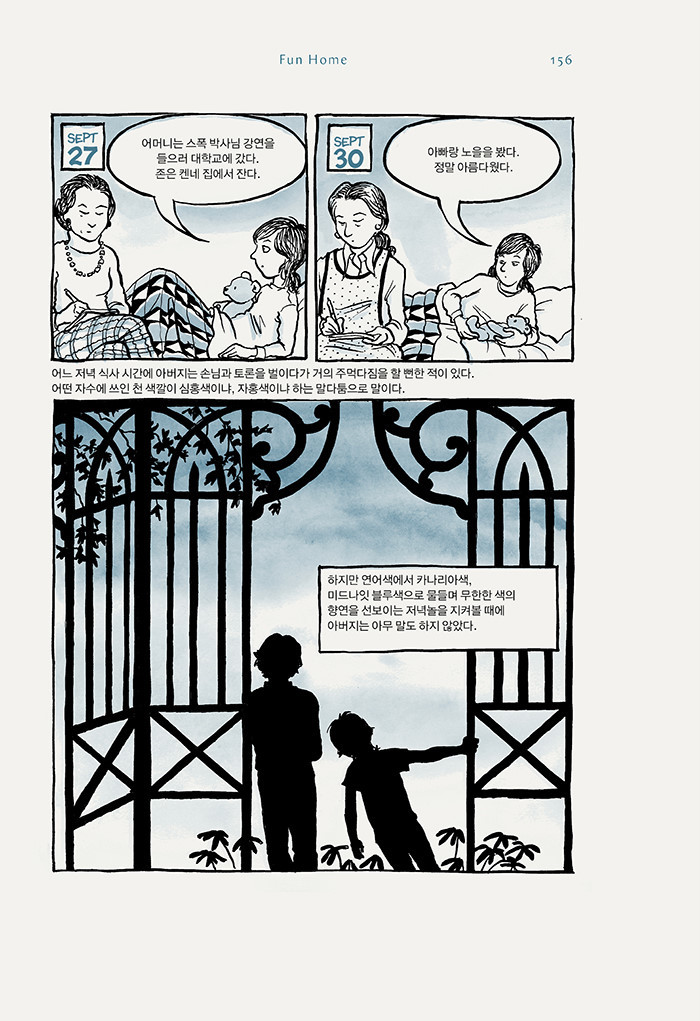 아버지와의 관계를 통해 가족 내 퀴어 정체성의 계보를 추적한 『펀 홈(FUN HOME)』은 벡델 테스트를 만든 작가 앨리슨 벡델의 베스트셀러 그래픽노블입니다. 커밍아웃한 레즈비언인 앨리슨은 고향인 미국 펜실베이니아의 시골 마을 비치 크리크에서 장례식장(FUNERAL HOME)의 장의사이자 영문학 교사로 일하다 돌연 죽음을 맞은 아버지 브루스 벡델의 수상한 죽음을 역추적해 갑니다.