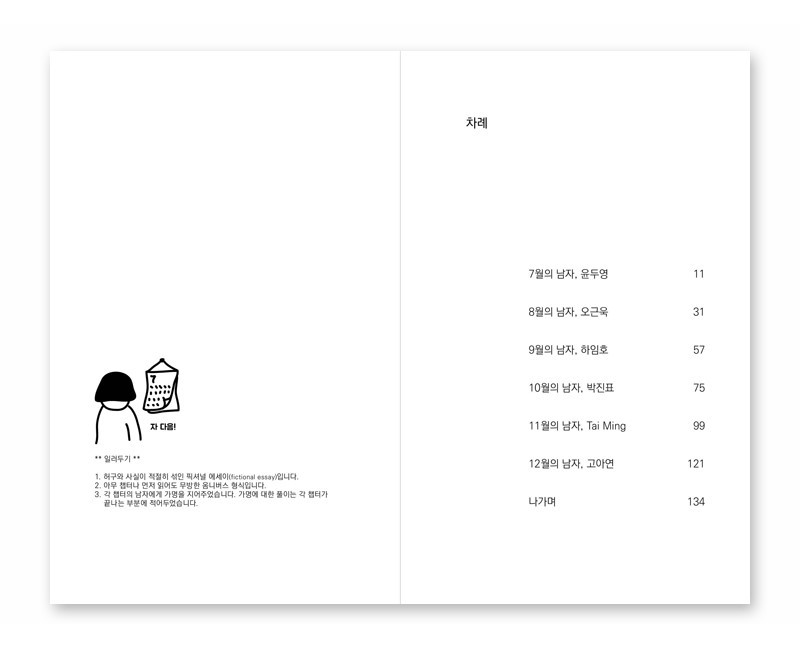 허구와 픽션이 적절히 섞인 픽셔널 에세이(fictional essay)입니다. 아무 챕터나 먼저 읽어도 무방한 옴니버스 형식으로 구성되어 있습니다. 각 챕터의 남자에게 가명을 지어주었습니다. 가명에 대한 풀이는 각 챕터가 끝나는 부분에 적어두었습니다.