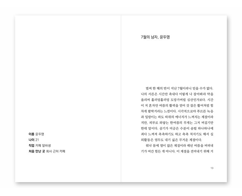 살면서 우리는 많은 사람을 만납니다. 머무르는 사람도 있지만, 떠나가거나 스쳐 가는 경우를 목도하는 일이 더 많습니다. 누군가 스쳐 지나간다 해도 삶을 멈출 수 없기에, 그럼에도 내 인생은 계속되기에 나는 또 앞으로 나아가야 합니다. 누군가를 경험하고 ‘바뀐 나’를 돌아볼 수도 있고, 전에는 미처 발견하지 못했던 ‘새로운 나’를 찾아낼 수도 있지요. 무의미하게 흩어져버릴 뻔한 경험과 감정들을 통해 ‘나’에 대해 곱씹어 보는 시간을 가져보는 것... 찰나의 관계마저도 내 인생의 밑거름이 되었으면 하는 바람으로 말이지요. 이처럼 <이달의 남자>는 ‘나’를 관찰하는 성장기입니다.