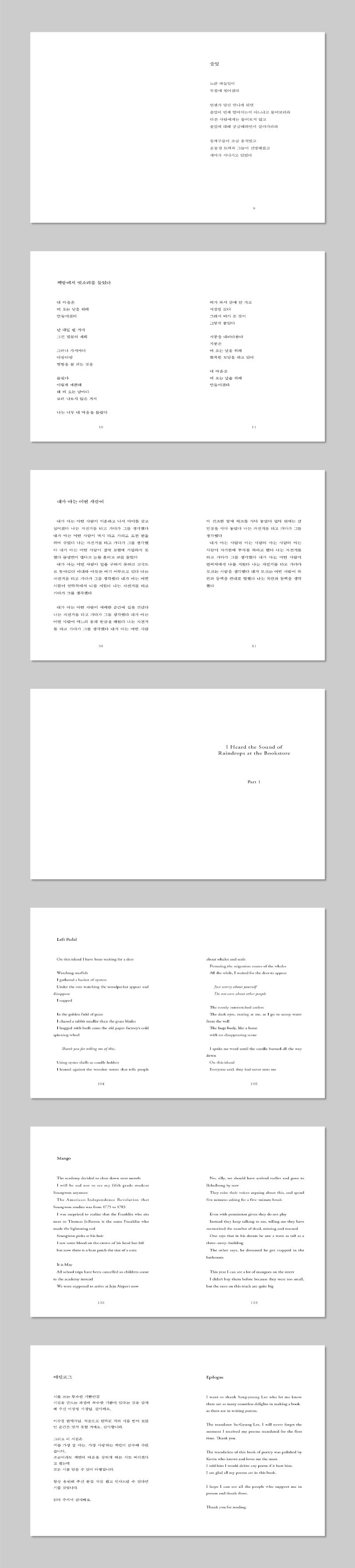 시인의 시를 읽으면 비 오는 오후 책방에 앉아 좋아하는 책을 펼칠 때처럼 촉촉하고 섬세해집니다. 시인은 적절한 거리를 유지하며 세상을 살핍니다. 오후의 벚꽃, 왼쪽 페달, 비디오테이프, 말차 케이크...처럼 일상 속에서 건져 올린 친근하고 감성적인 시어들이 우리의 마음에 더 가까이 닿습니다.