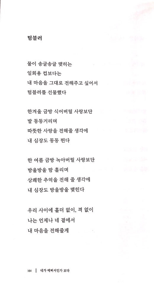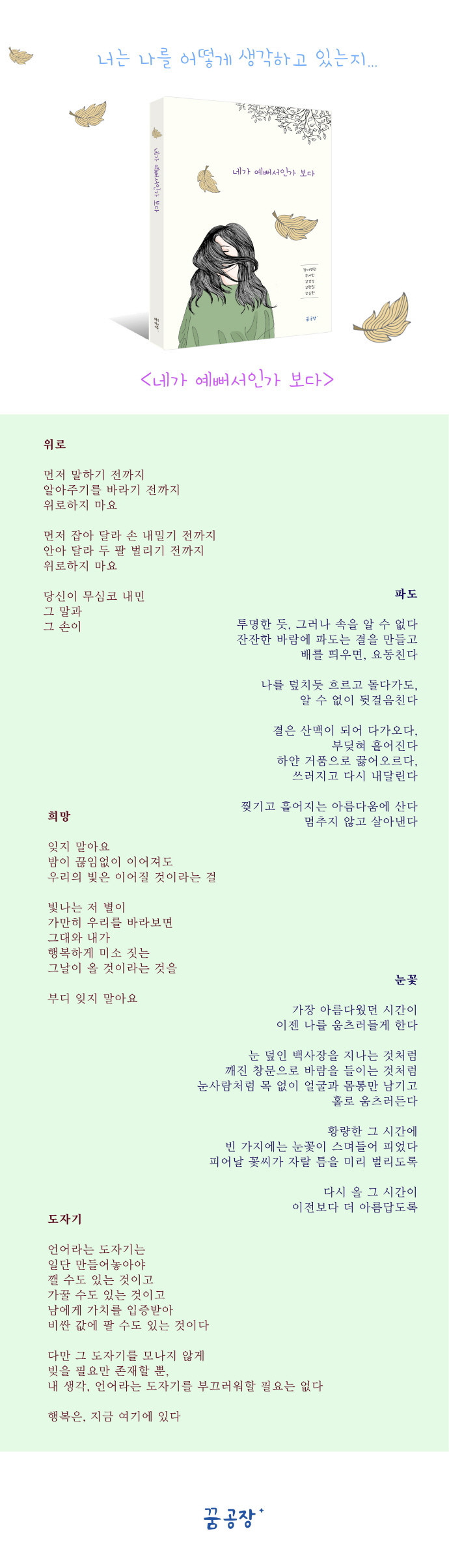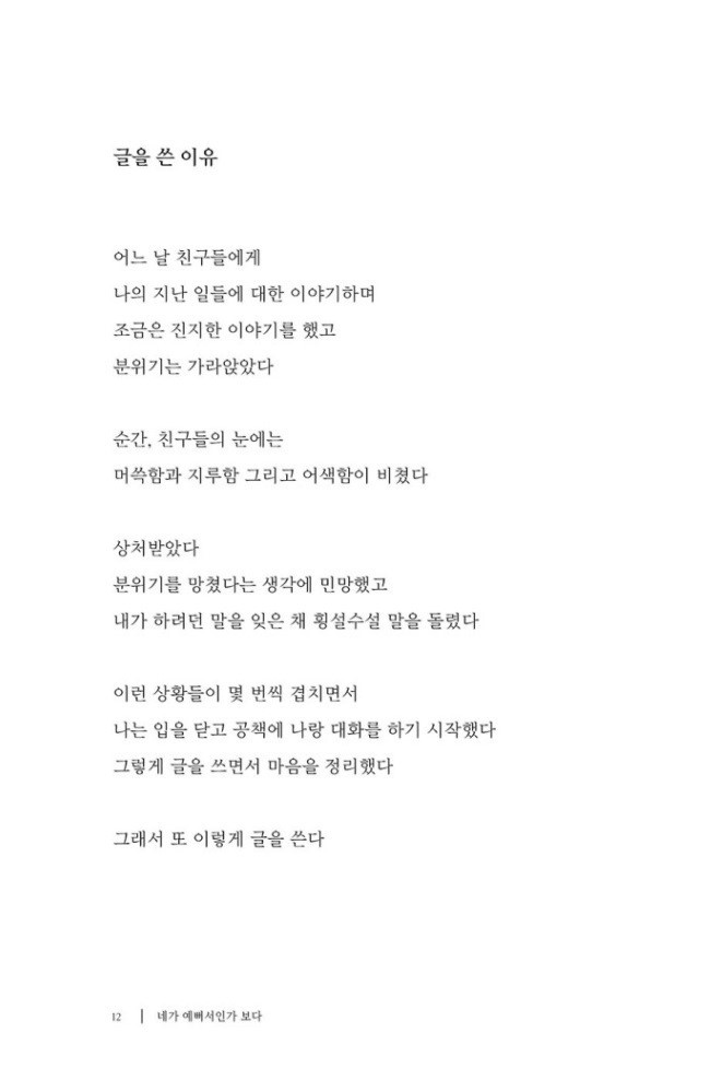책 ‘네가 예뻐서인가 보다’를 통해 함께 공감하고, 위로 받으며 조금은 시린 세상 속에서 따뜻한 감성 한모금 하실 수 있을 것으로 기대됩니다.