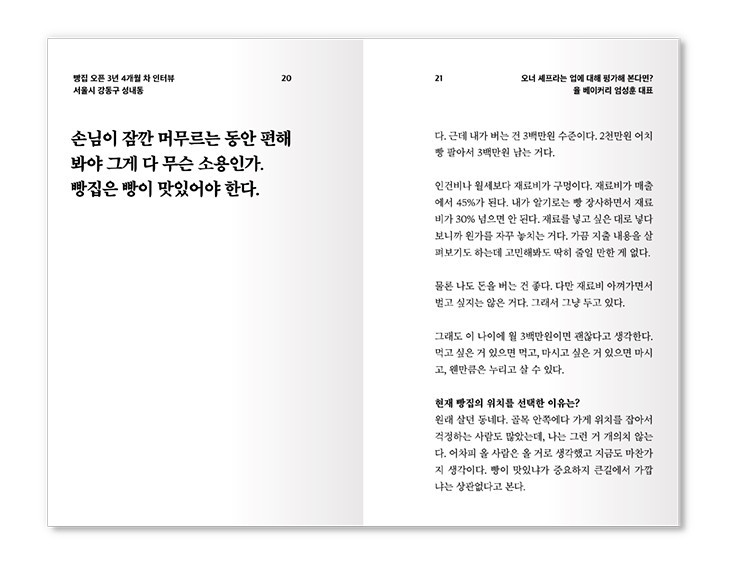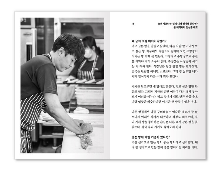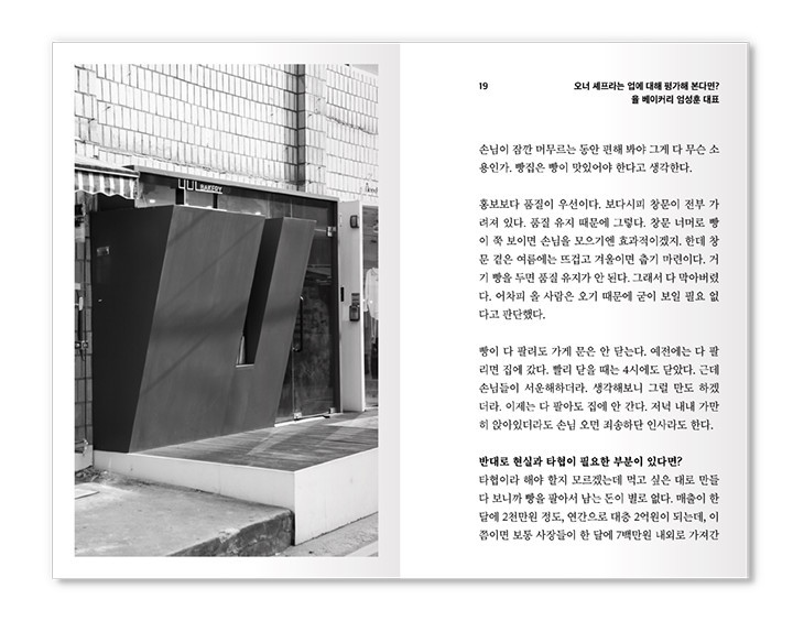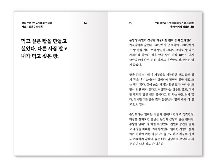 오픈 3년 이하, 구성 인원 5인 내외, 서울의 소규모 빵집들과 인터뷰했다. 알다시피 서울 시내에 빵집은 이미 수없이 많다. 대형마트, 지하철 역사, 심지어 편의점까지도 베이커리가 입점해 있거나 빵을 만들어 판매한다. 그 와중에 무슨 생각으로 새롭게 경쟁에 뛰어드는지 묻는다. 가깝고, 싸고, 양도 많이 주는 프랜차이즈 매장을 두고 구태여 로컬 베이커리를 찾을 이유는 도대체 뭔가?