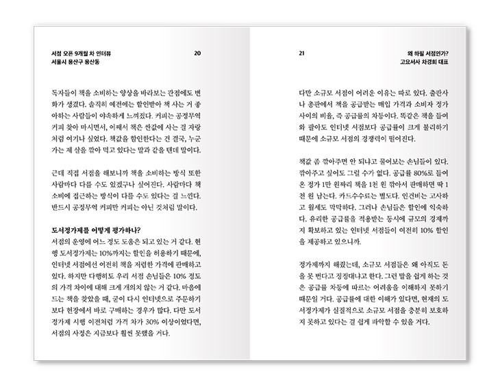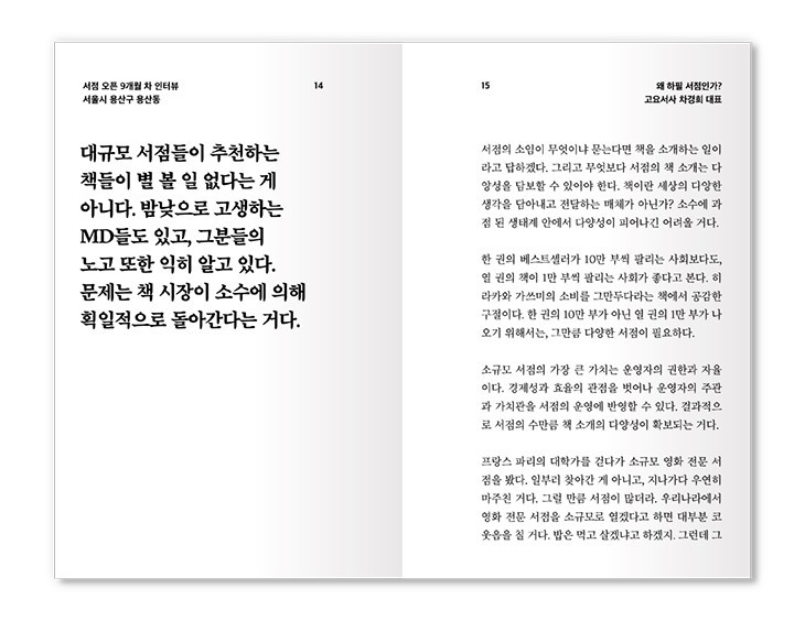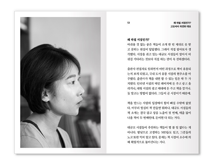 기어이 책을 팔겠다고 문을 여는 서울의 오픈 3년 이하 소규모 서점들과 인터뷰했다. 인터넷 서점과 대형 서점이 각축을 벌이는 각박한 환경 속에 그들이 직면한 현실을 묻는다. 서점의 당위나 명분을 넘어, 매월 임차료를 감당하는 상가 세입자로서, 책이라는 상품을 소개하는 상업 공간의 운영자로서 경험과 고민을 듣는다. 과연 책 팔아서 먹고살 수 있겠나?