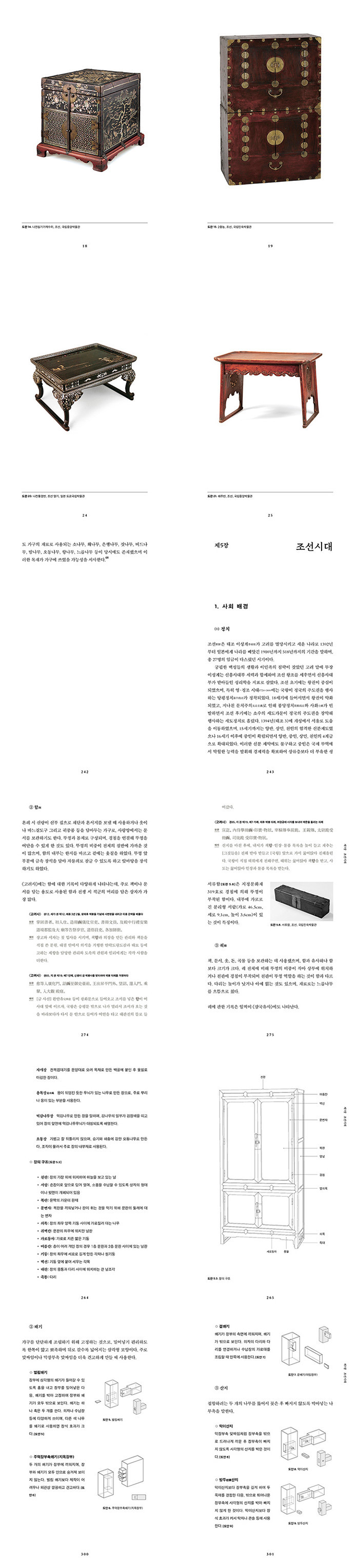 특히 가구는 생활문화, 도구, 공예(디자인) 분야와도 밀접하게 연관되므로, 독자들은 이를 생활문화사, 물질문화사, 예술사의 맥락에서 이해할 수 있을 것이다. 고화질 컬러도판과 가구 조립 도안 53점 등 총 233점의 도판을 수록했으며, <삼국사기>, <삼국유사>, <고려도경>, <고려사>, <고려사절요>, <조선왕조실록>을 비롯해 각 시대 문헌의 관련 기록 및 그림 자료를 세심하게 분석했다.