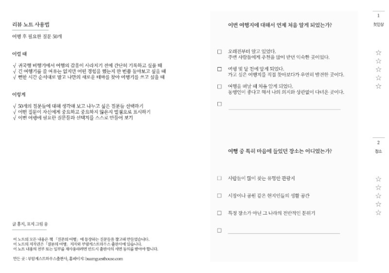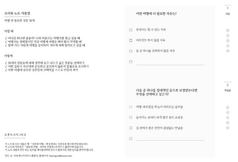 책 <질문의 여행>에 등장하는 252개의 질문들 중 여행 전에 나의 여행의 모습을 미리 그려볼 수 있는 50개의 질문 (프리뷰노트),