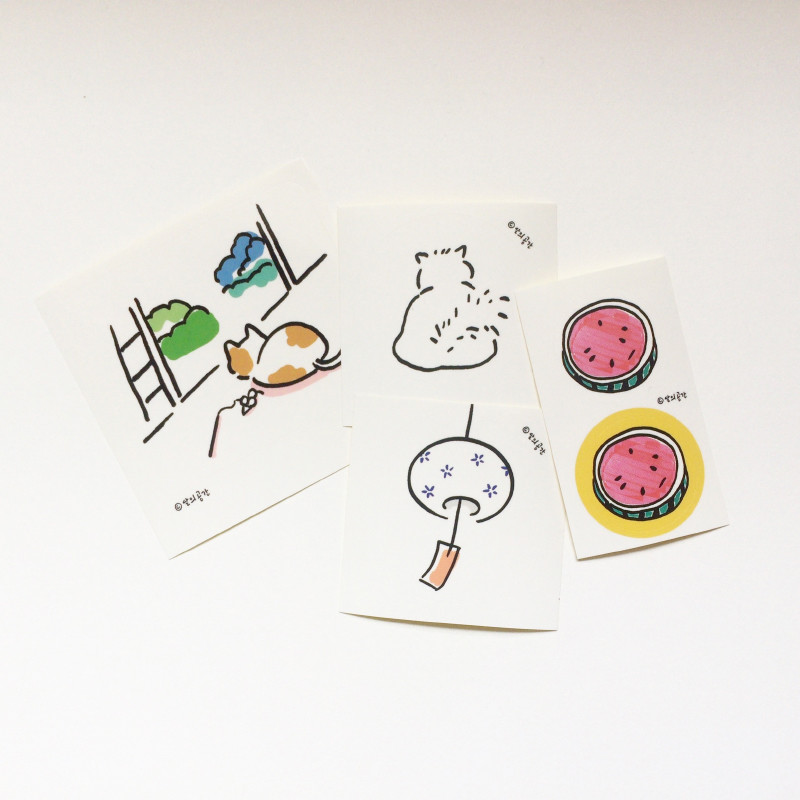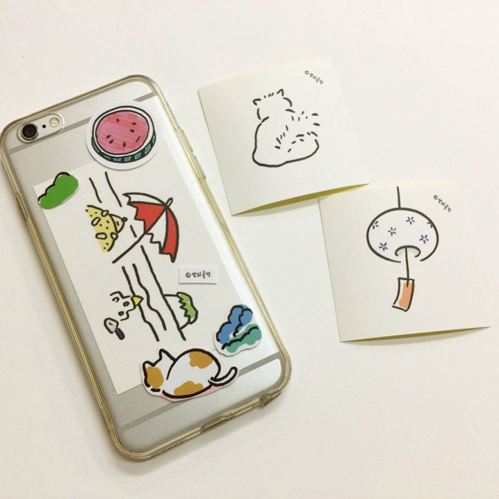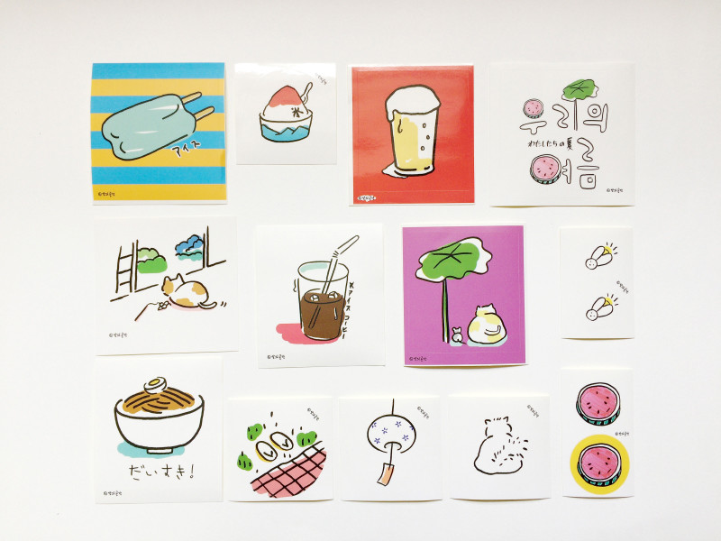 우리가 느끼고 경험한 여름의 분위기가 물씬 느껴지는 드로잉들로 구성된 원형+사각스티커입니다.