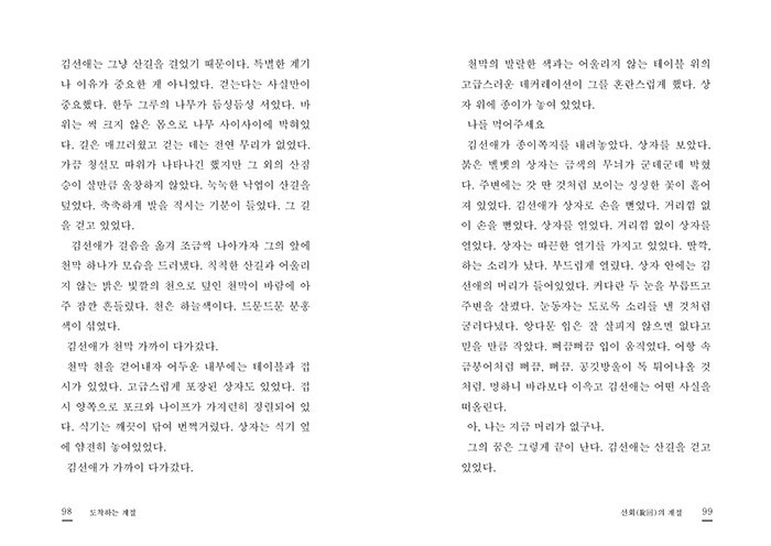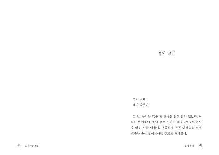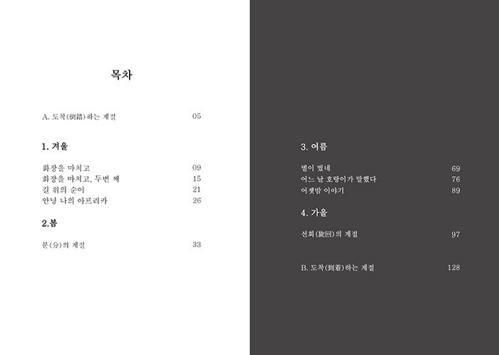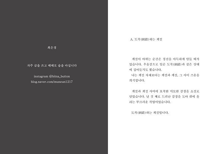 겨울과 여름에는 짤막한 감정을, 봄과 가을에는 좀 더 긴 감정을 담았습니다. 도착(倒錯) 혹은 도착(到着)하는 계절입니다.
